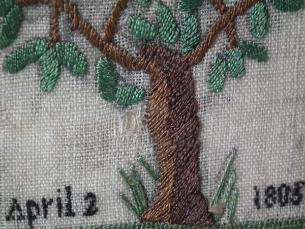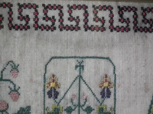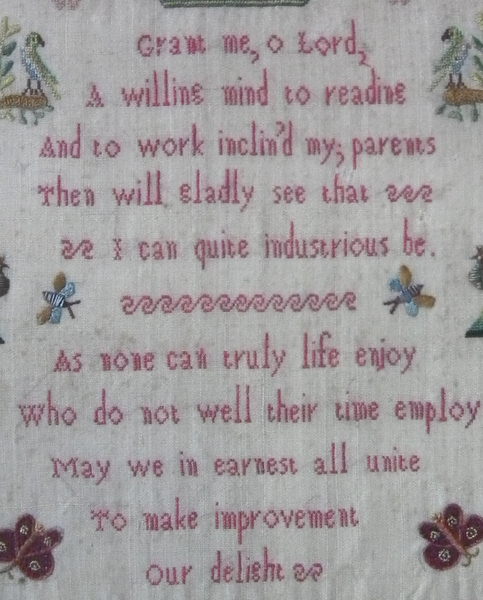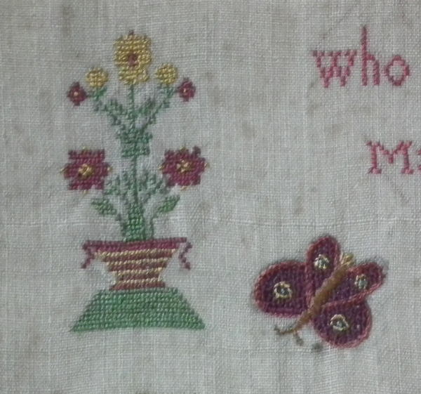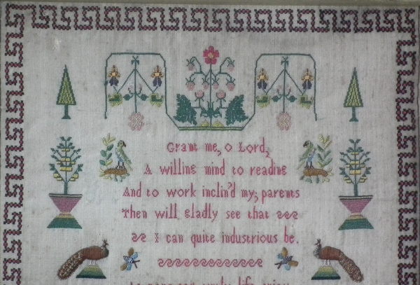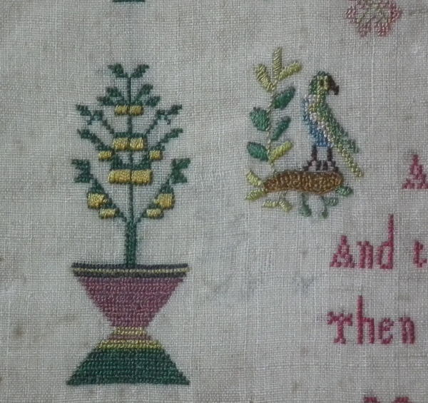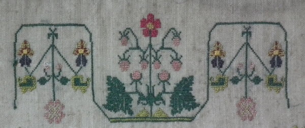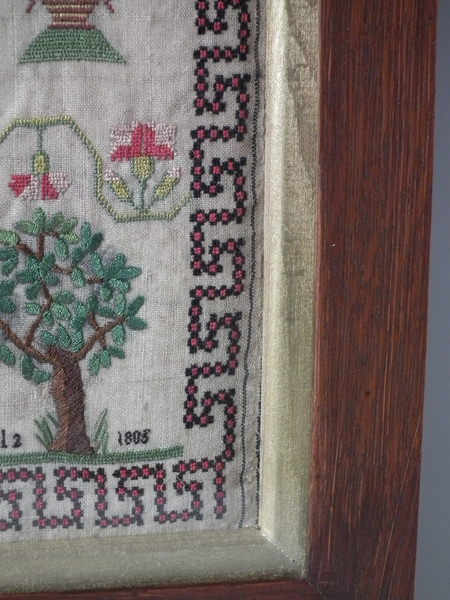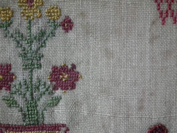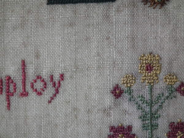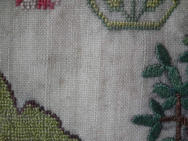 The sampler is worked in silk on linen ground, in a variety of stitches.