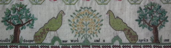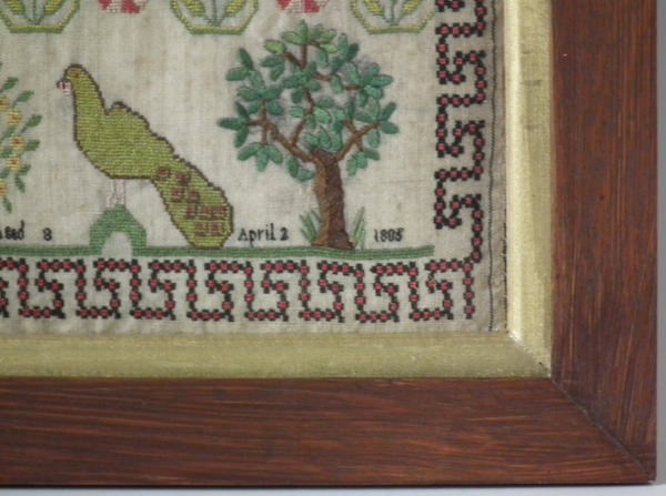George III, dated April 2 1805. 16ins by 12.5ins wide. 1805 Peacock Sampler by Priscilla Cooper. Framed in an old wood frame with gilt slip and glass.
