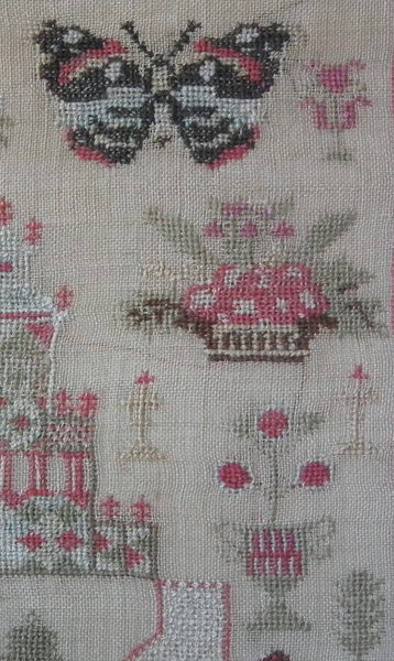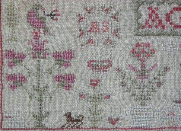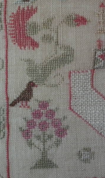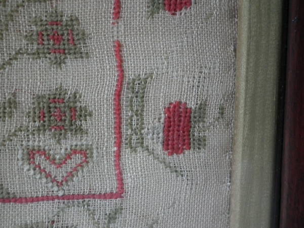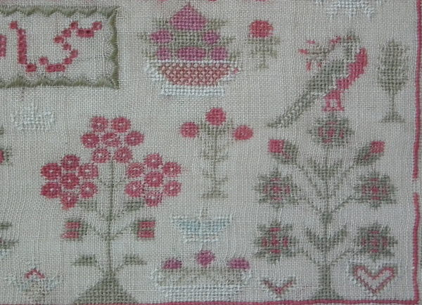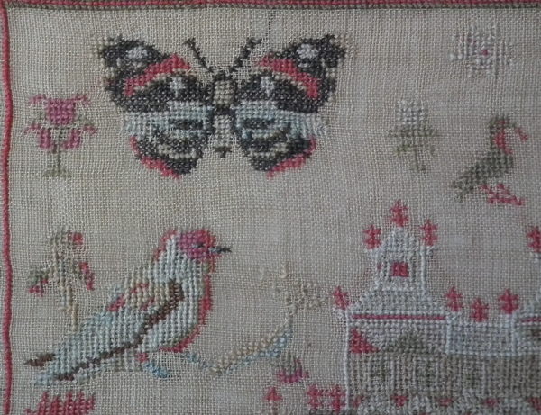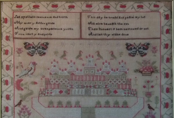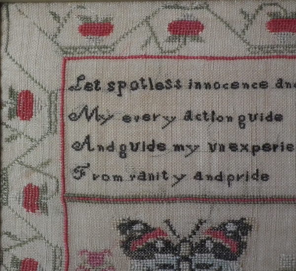 The sampler is worked in fine wool and silk on canvas ground, in a variety of stitches including Algerian eye.