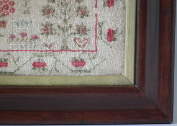 Victorian, dated 1846. 24.25ins by 21ins wide. 1846 Sampler by Margaret Iceton. Framed in an old wood frame with gilt slip and glass.