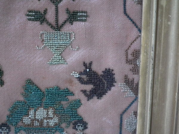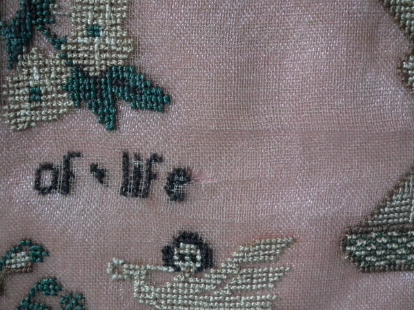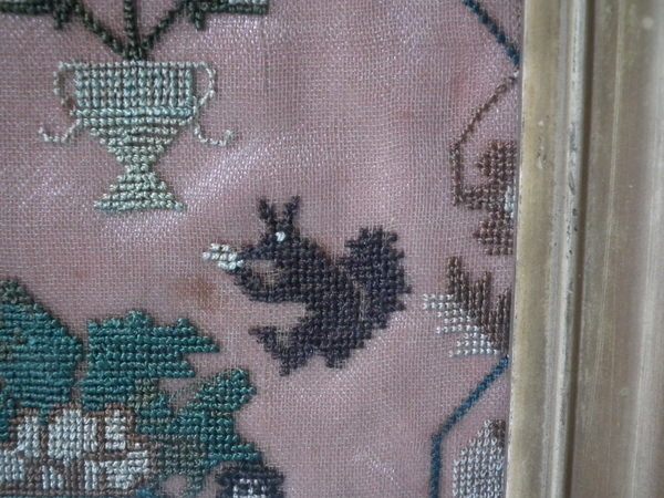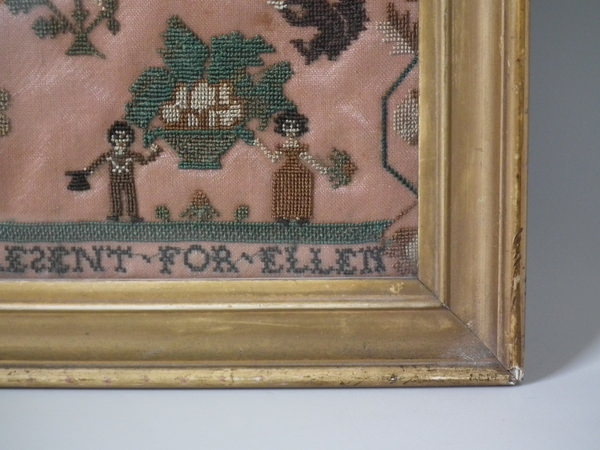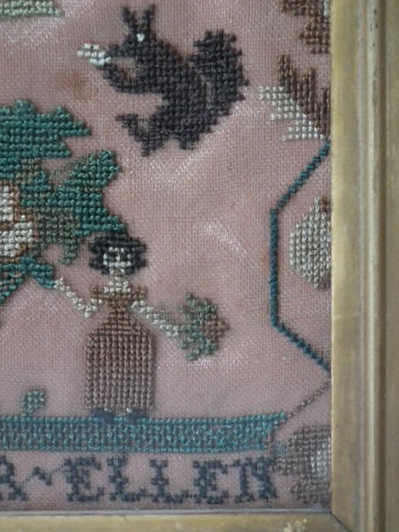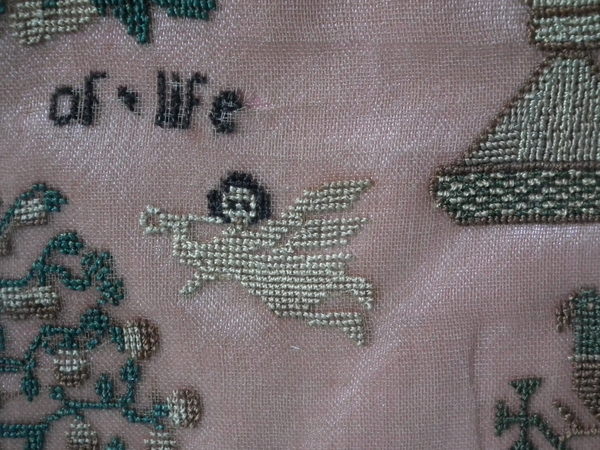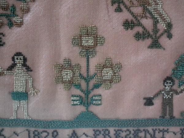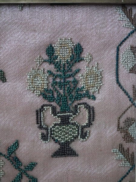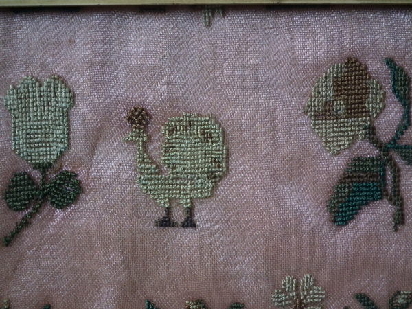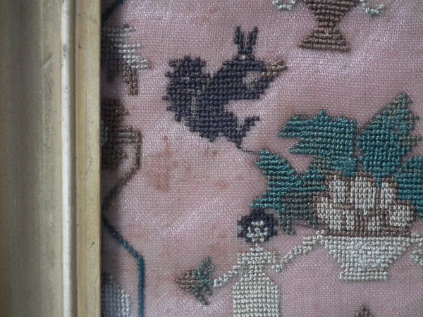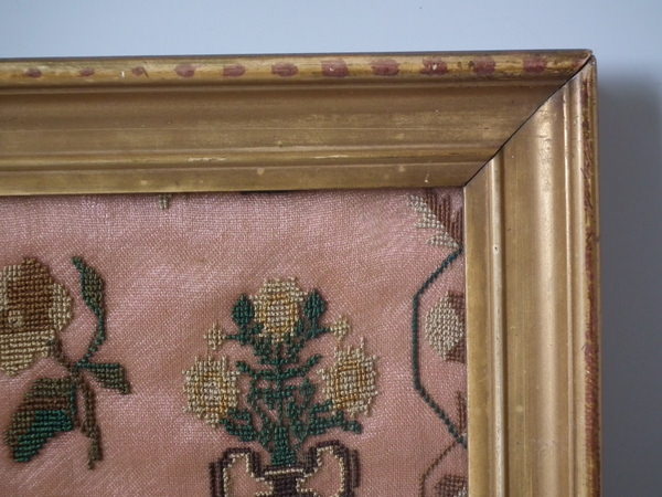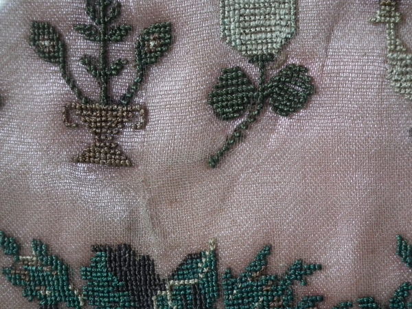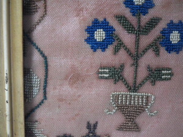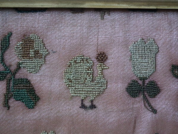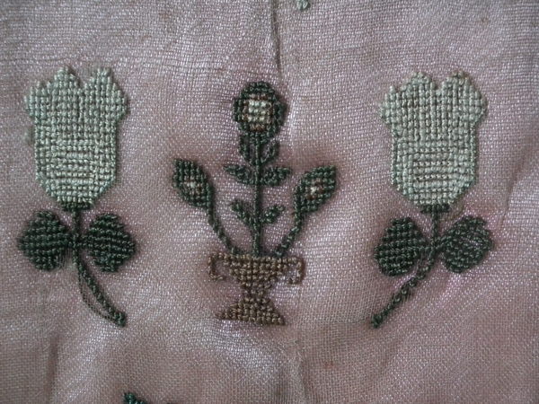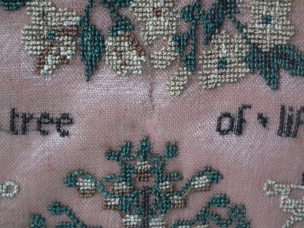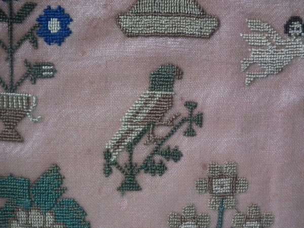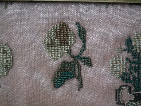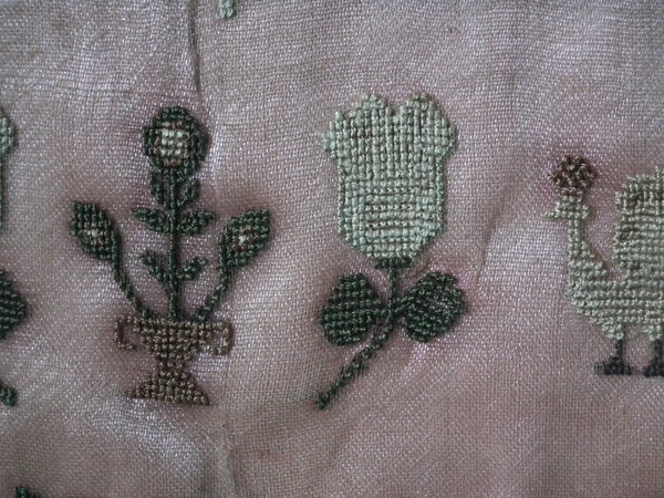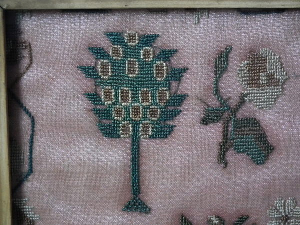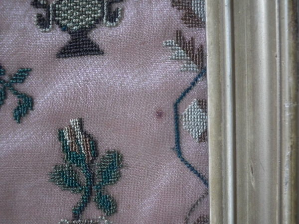 The sampler is worked in silk on linen ground, in cross stitch throughout.