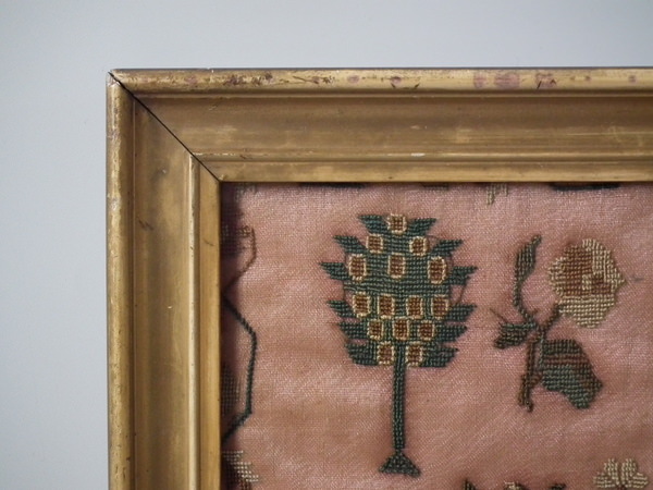George IV, dated 1829. 11.25ins by 14.5ins wide. 1829 Sampler by Grace Whiteley. Framed in an old 'molded composition over wood' frame with rippled, old glass.