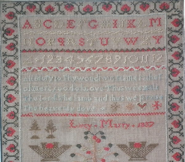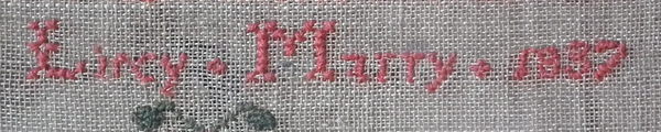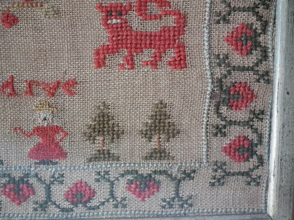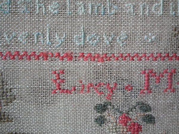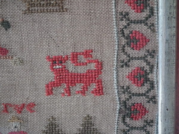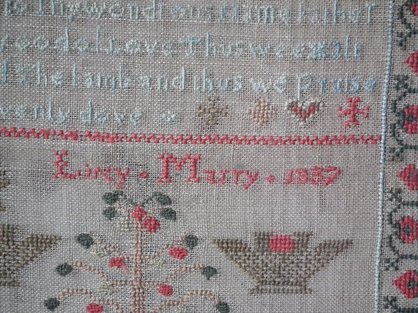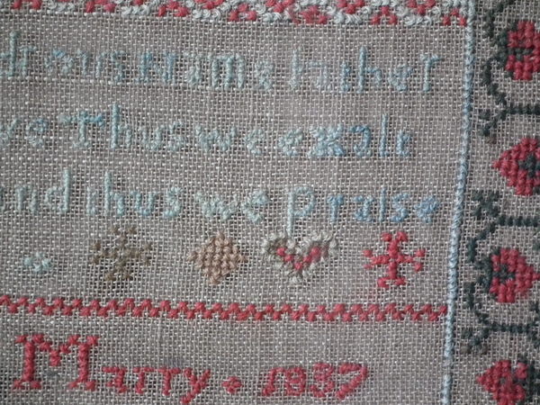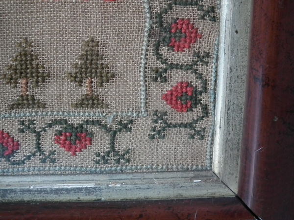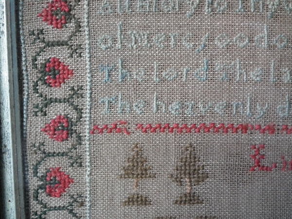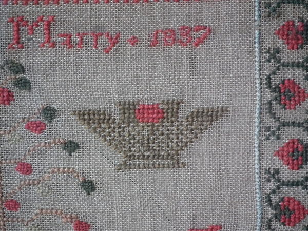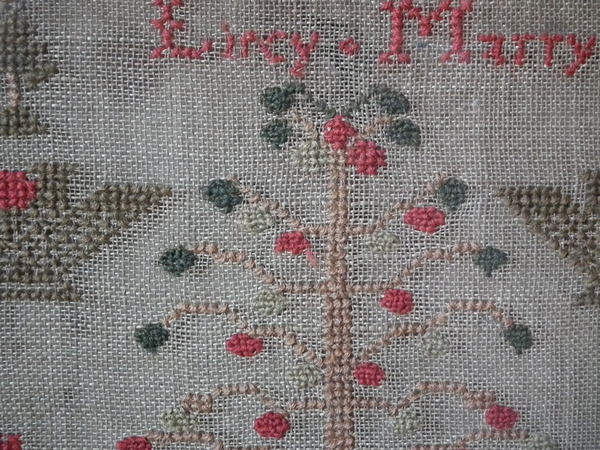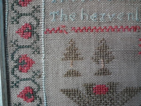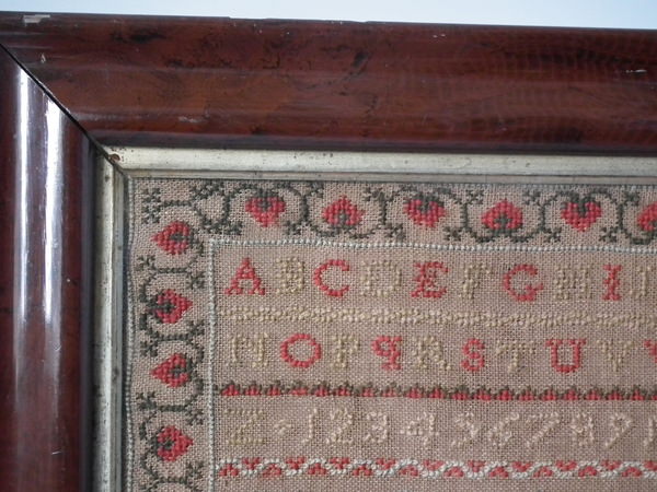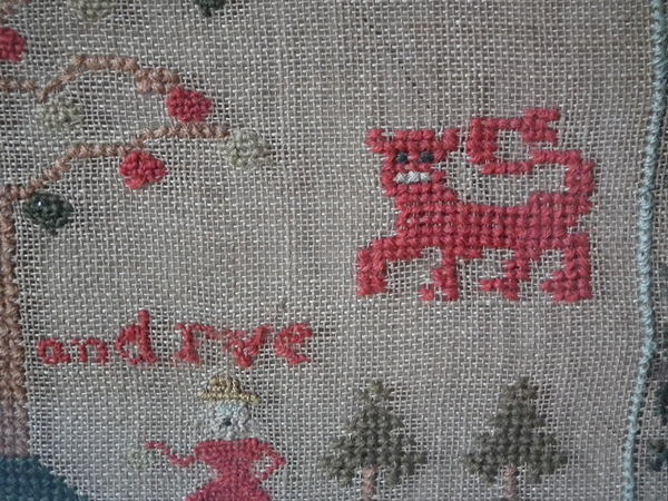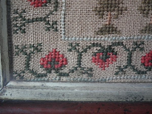 The sampler is worked in wool and a cotton-like thread on canvas ground, in cross stitch throughout.