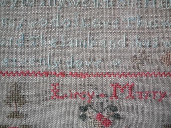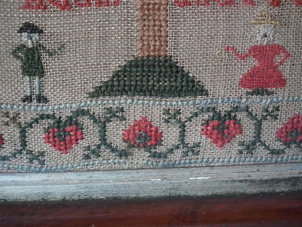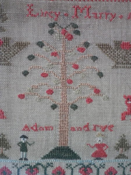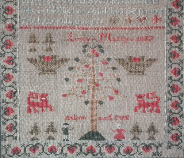 Victorian, dated 1837. 15.75ins by 11.75ins wide. 1837 Adam & Eve Sampler by Lucy Marry.