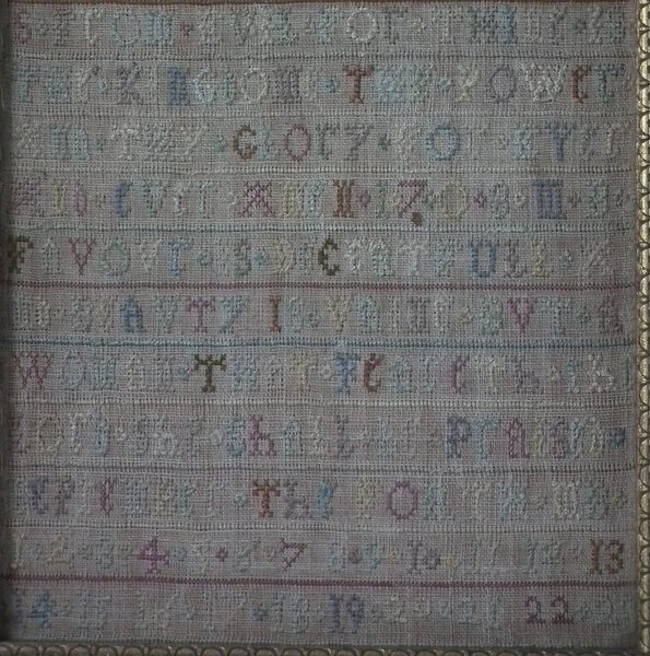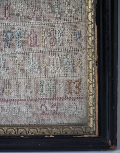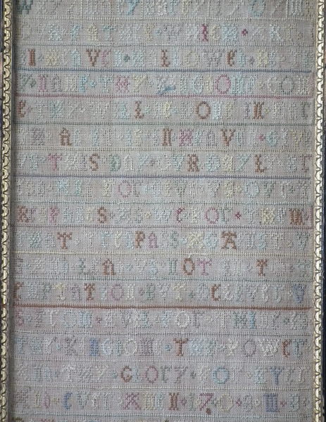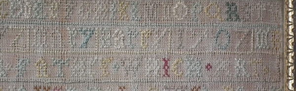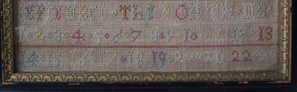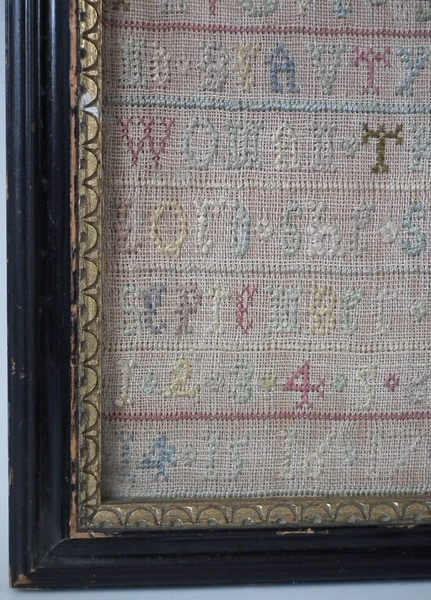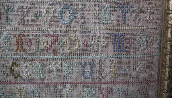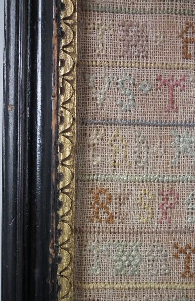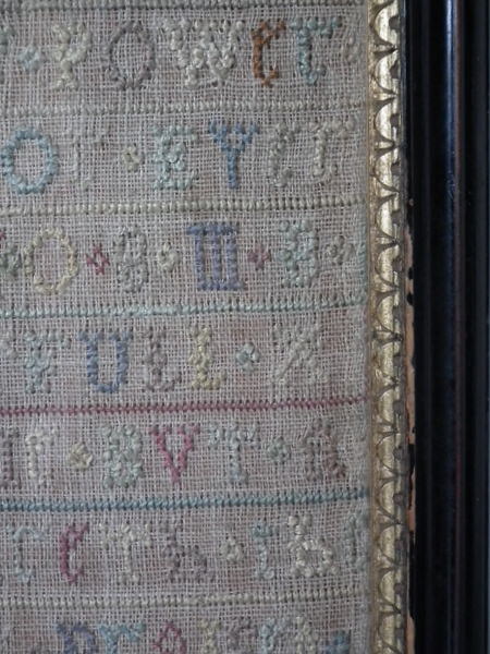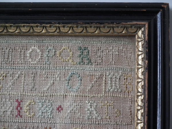 The sampler is worked in silk on linen ground, in cross stitch throughout.