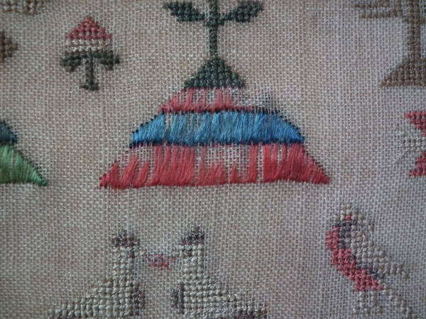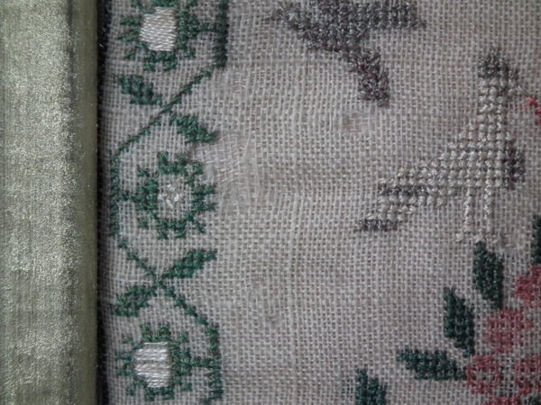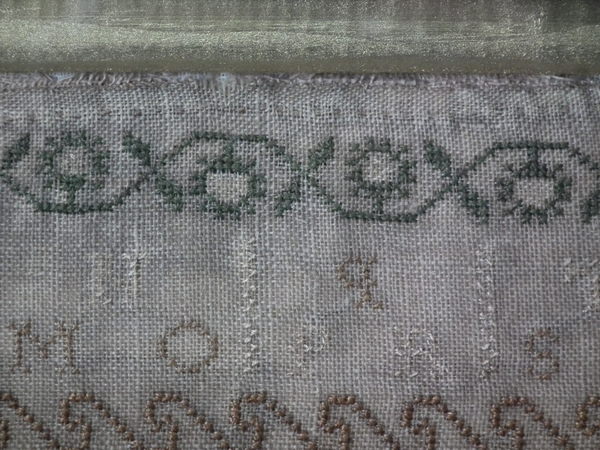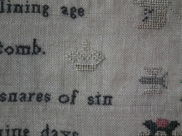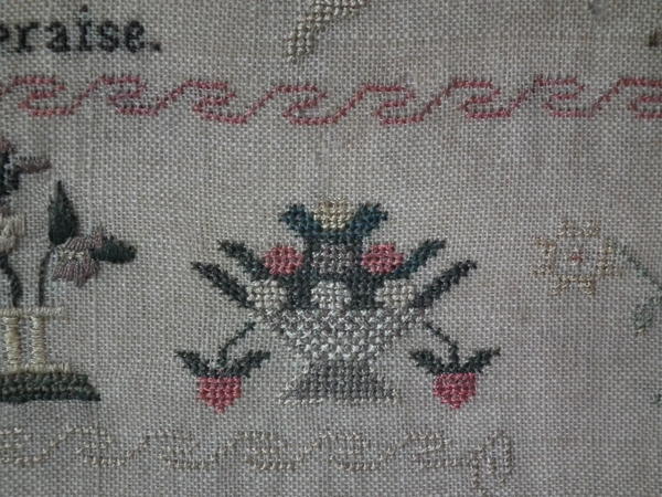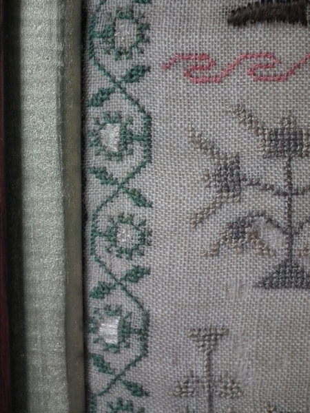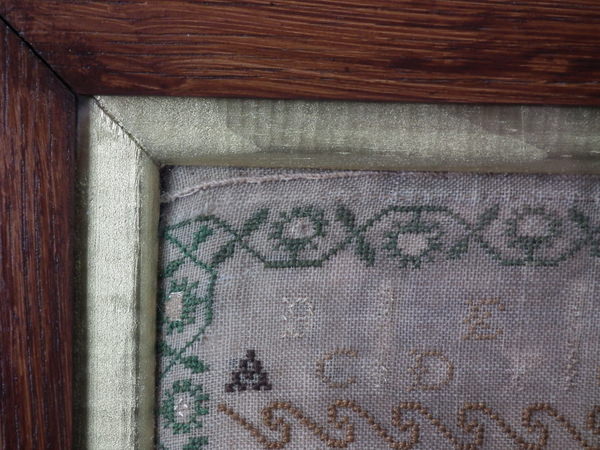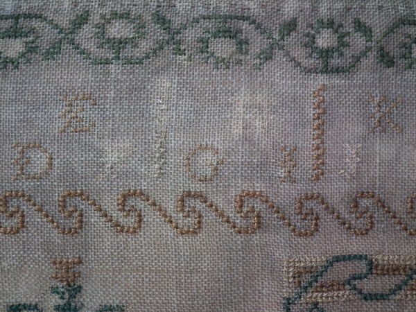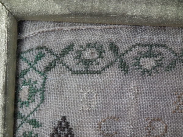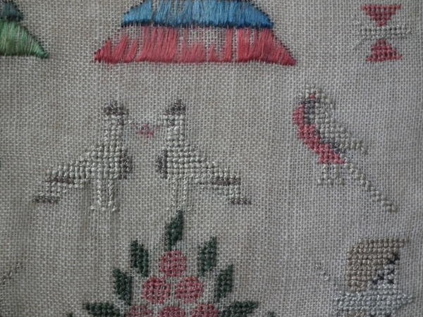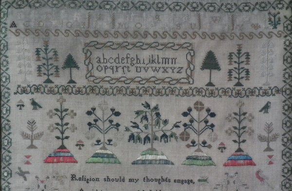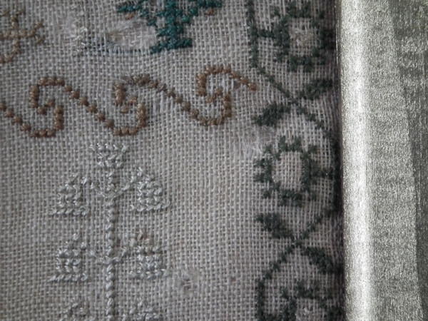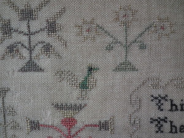 The sampler is worked in silk on linen ground, in a variety of stitches.