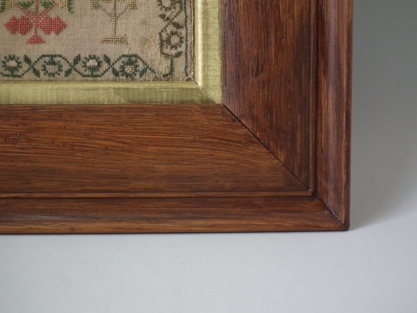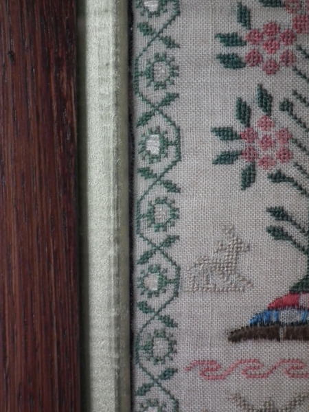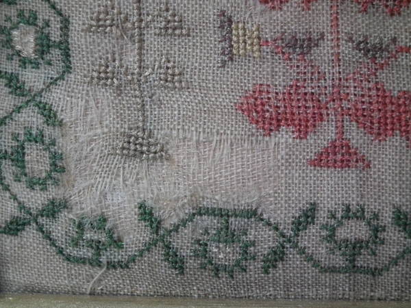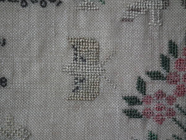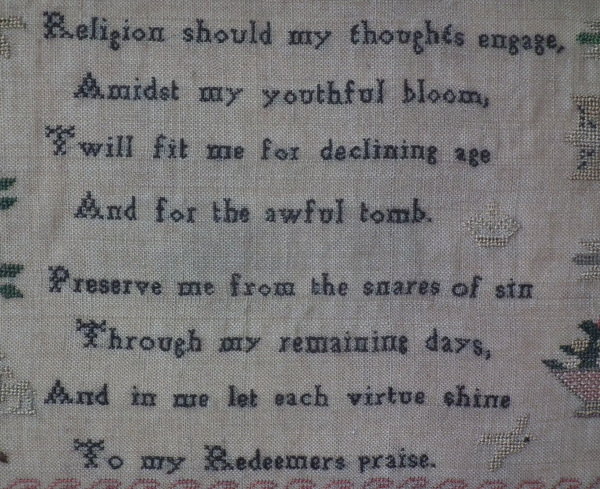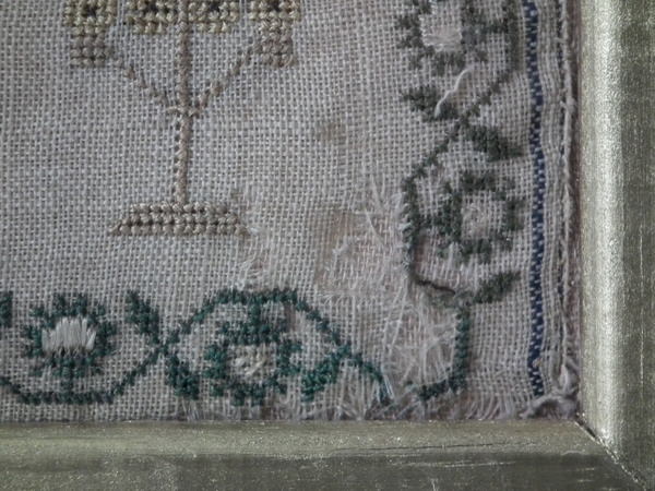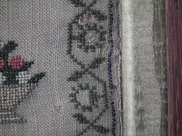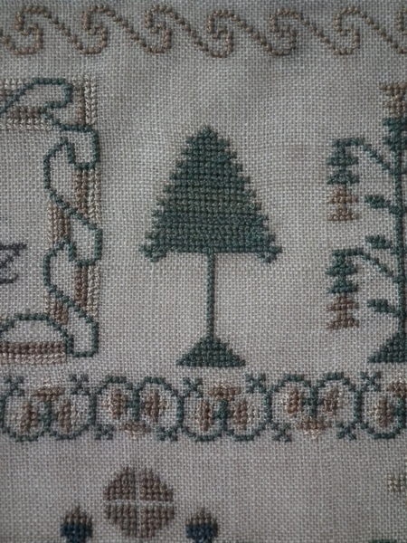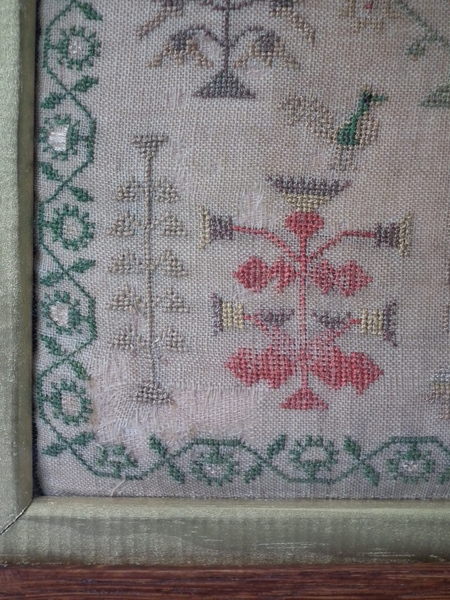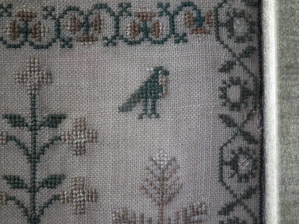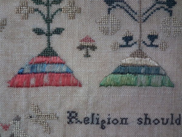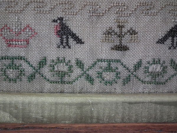 The sampler is worked in silk on linen ground, in a variety of stitches.