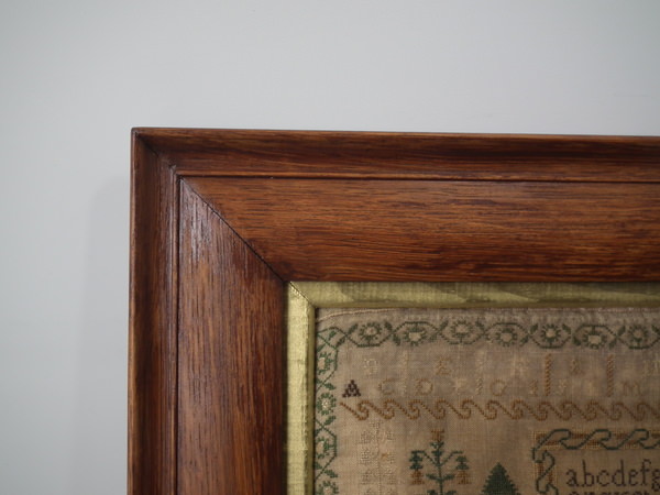1831 Sampler by Elizabeth Johnson. Framed in an old wood frame with gilt slip and glass.