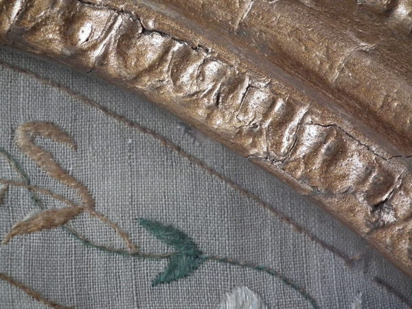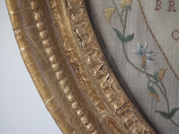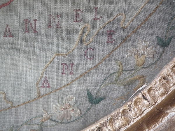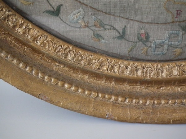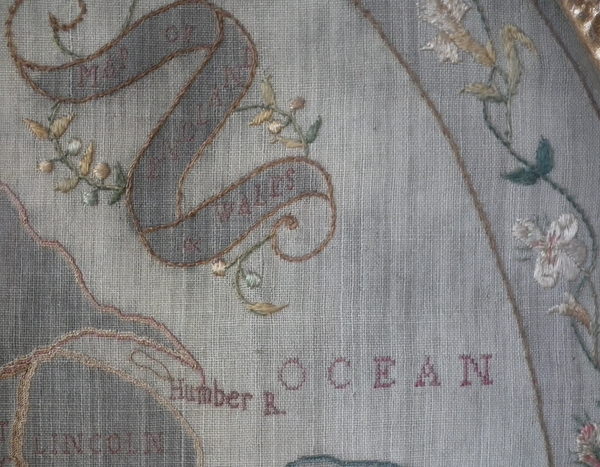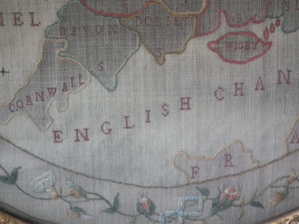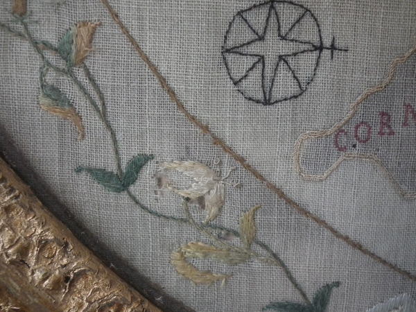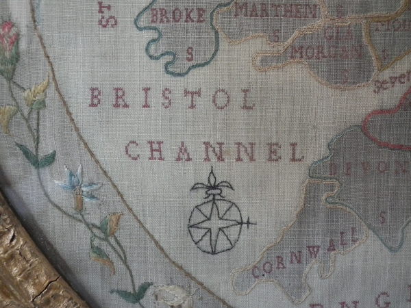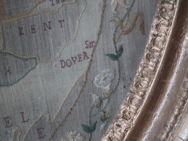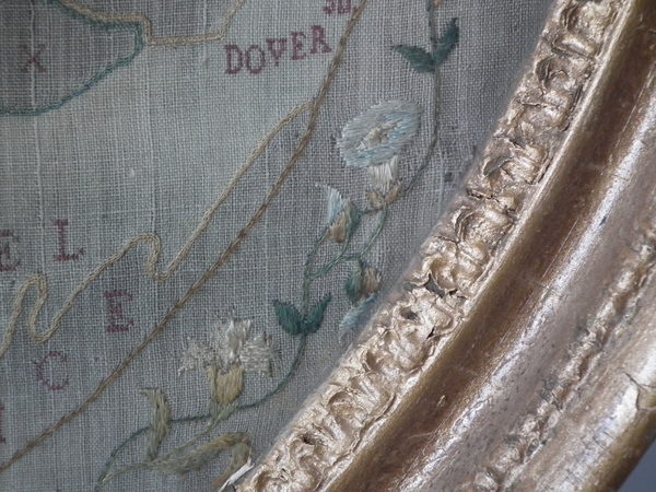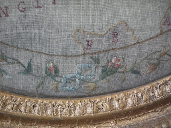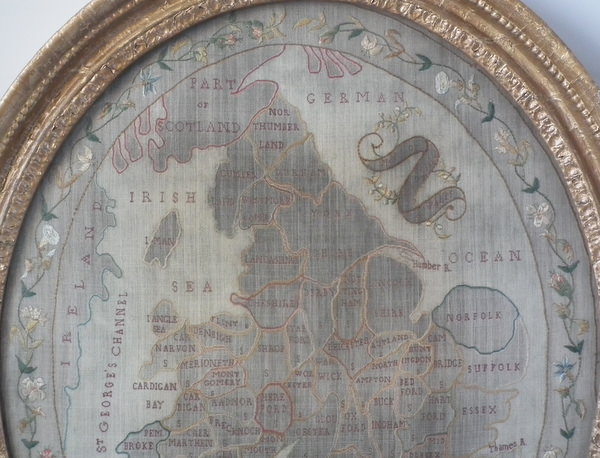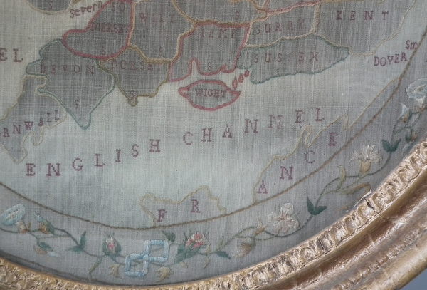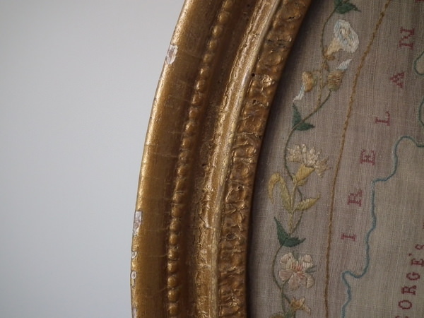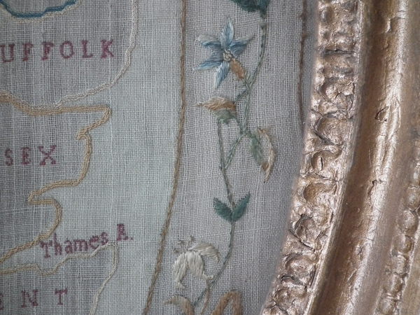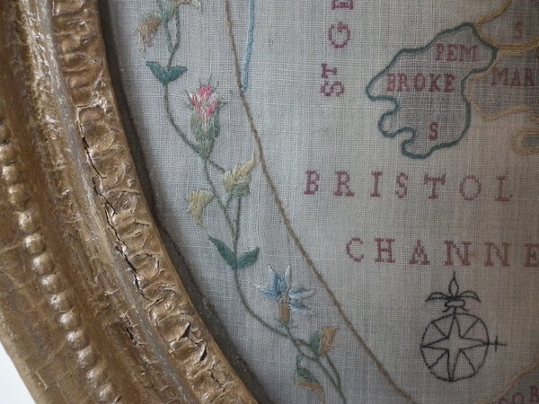 Circa 1800. 20ins by 17ins wide. Circa 1800 England & Wales Map Sampler. Framed in an old, gilded, gesso frame with glass.