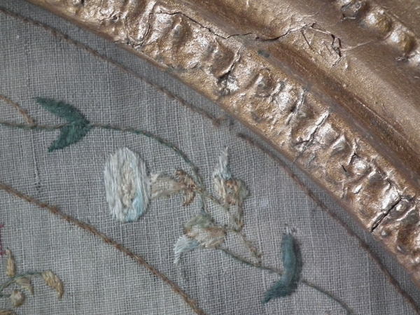 The sampler is worked in a silk-like thread on linen ground, in a variety of stitches.
