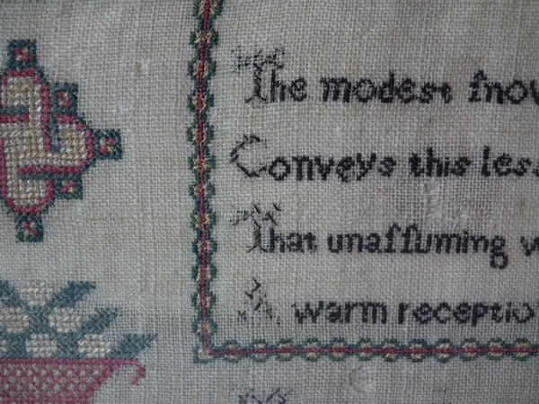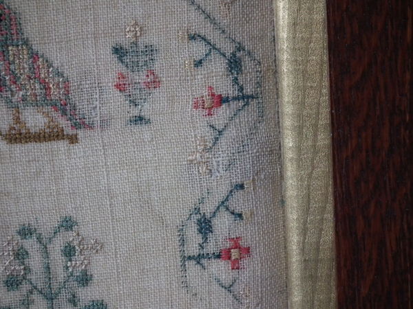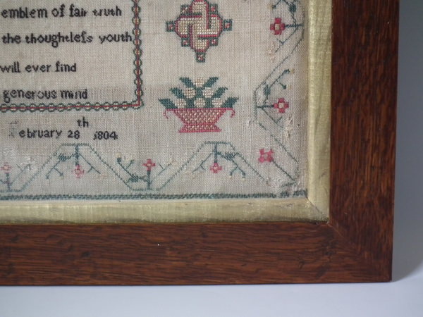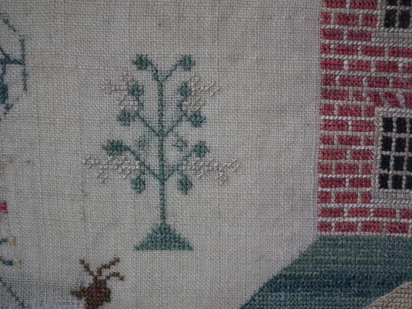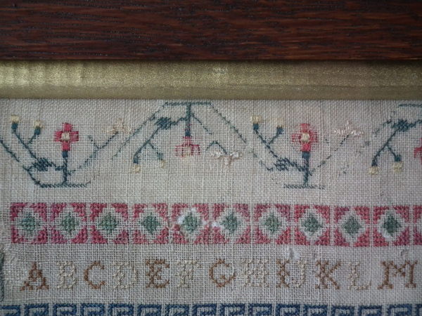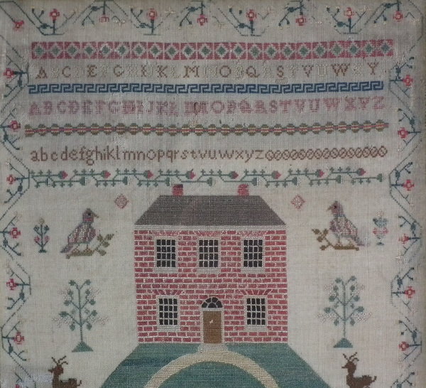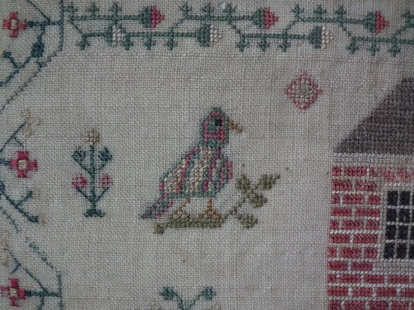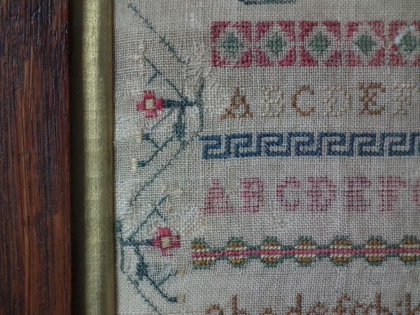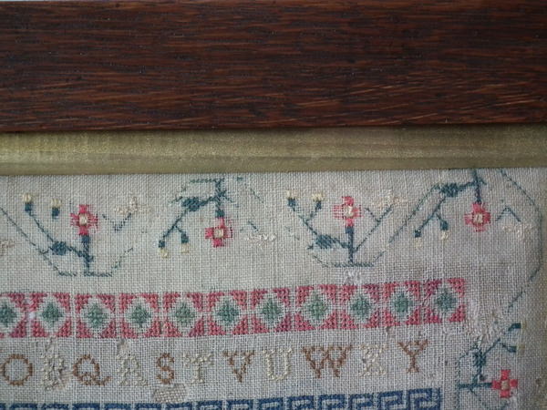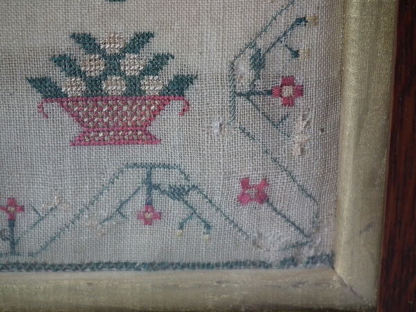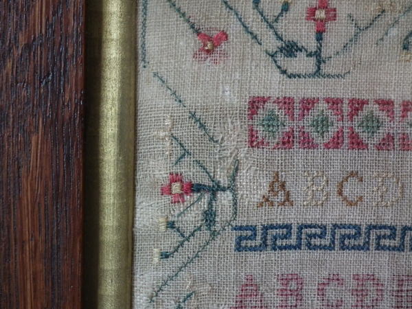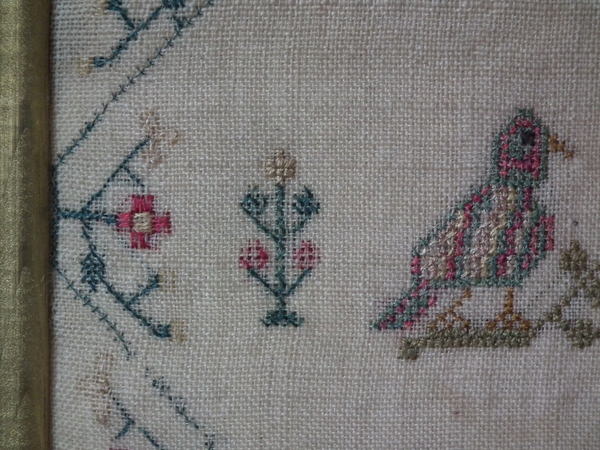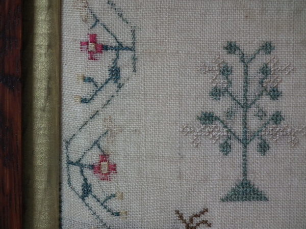 The sampler is worked in silk and cotton on linen ground, in a variety of stitches.