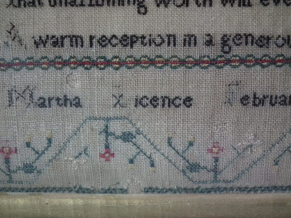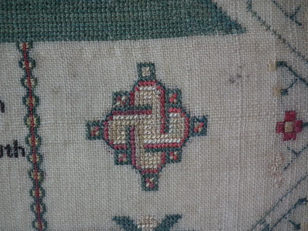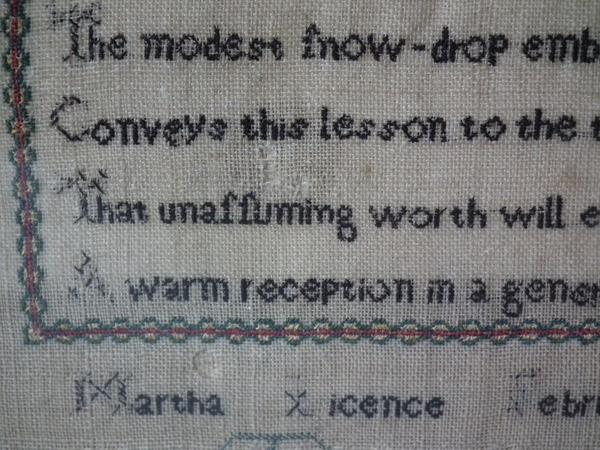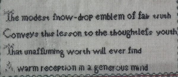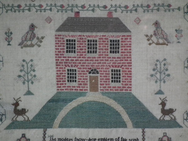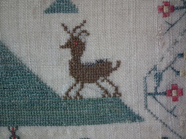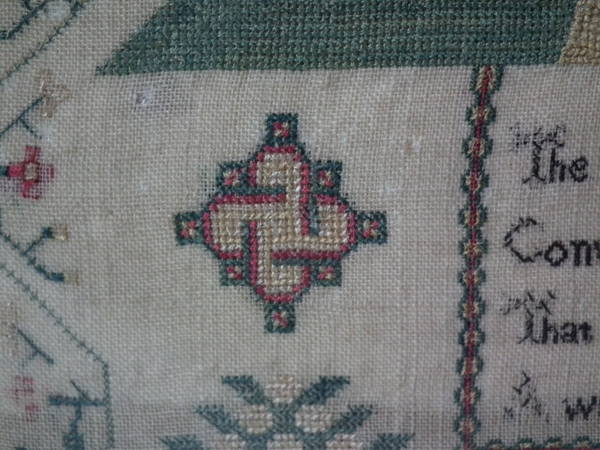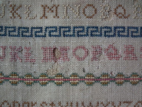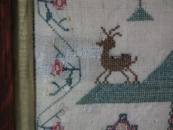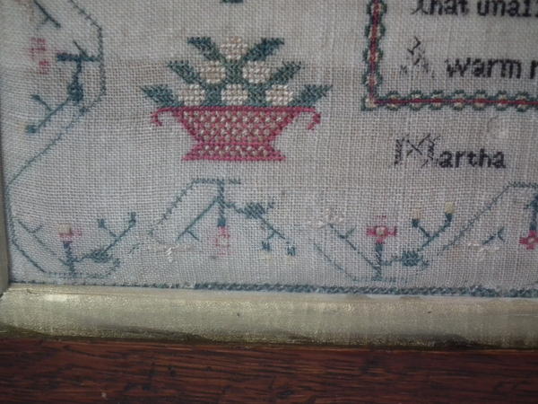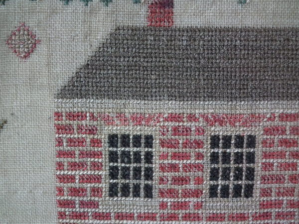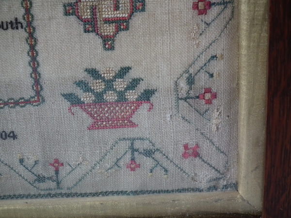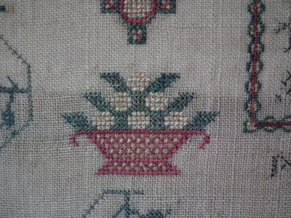 The sampler is worked in silk and cotton on linen ground, in a variety of stitches.