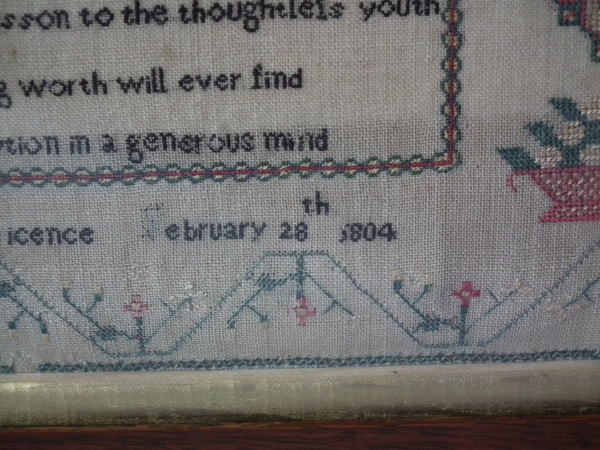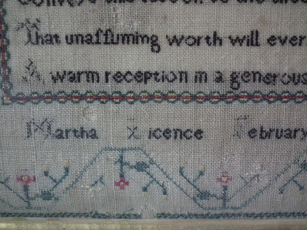 George III, dated February 28th 1804. 15.5ins by 11.75ins wide. 1804 House Sampler by Martha Licence. Framed in an old wood frame with gilt slip and glass.