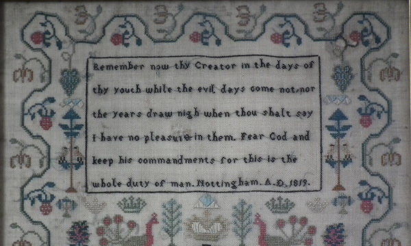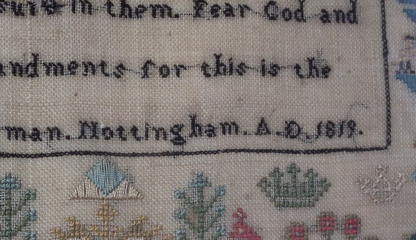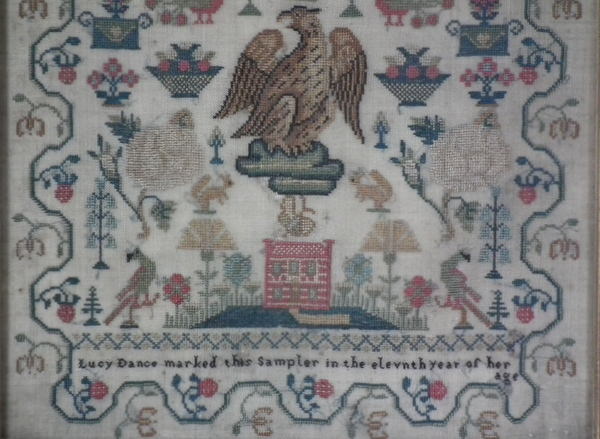 Signed and dated 'Lucy Dance marked this Sampler in the elevnth year of her age. Nottingham. A.D. 1819.' Nottingham is a town in England.