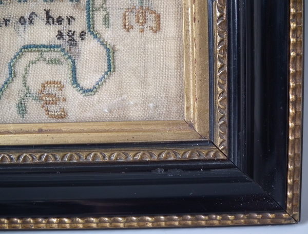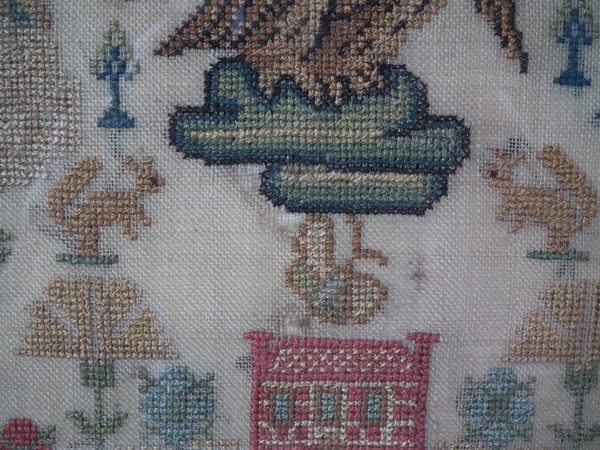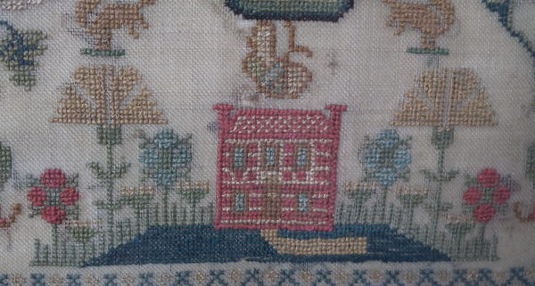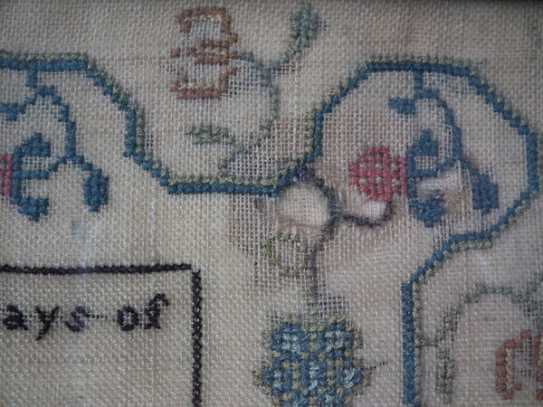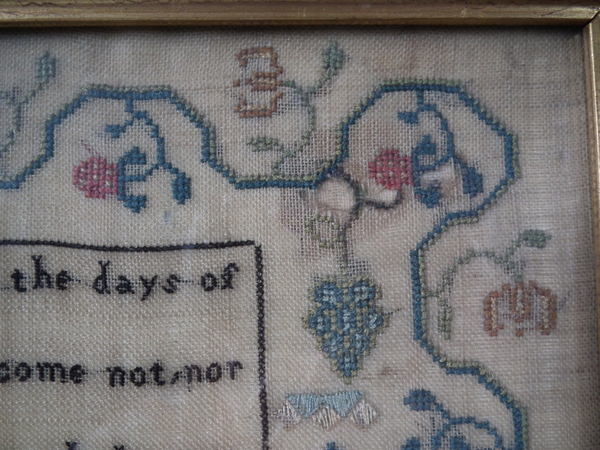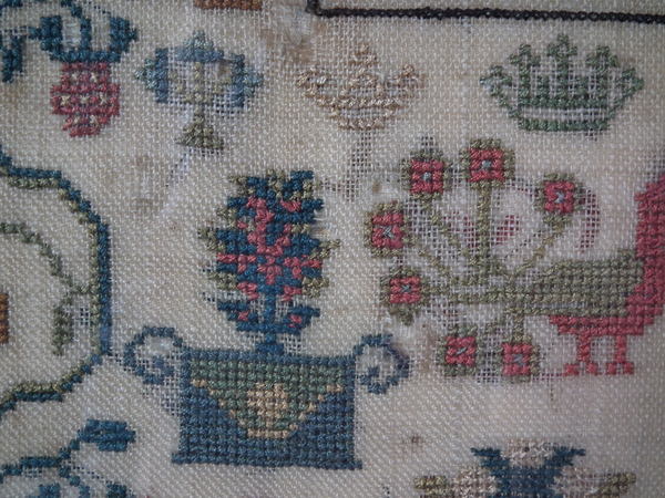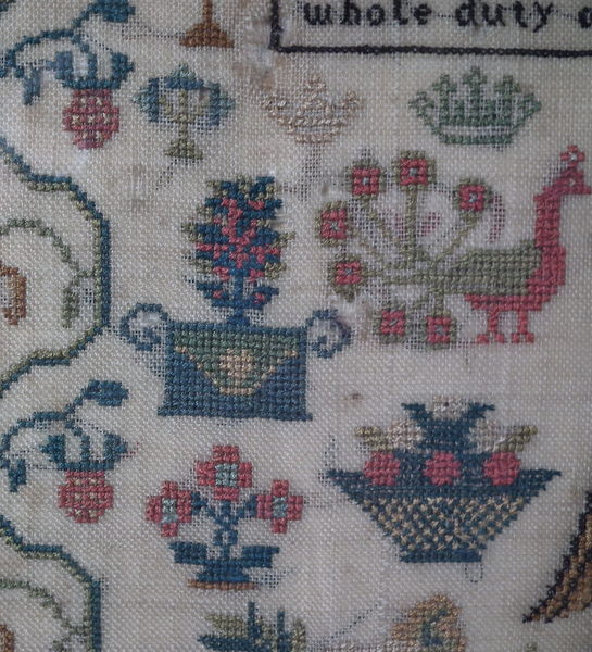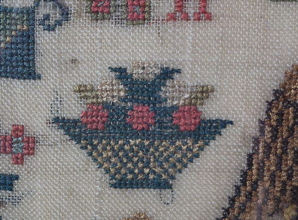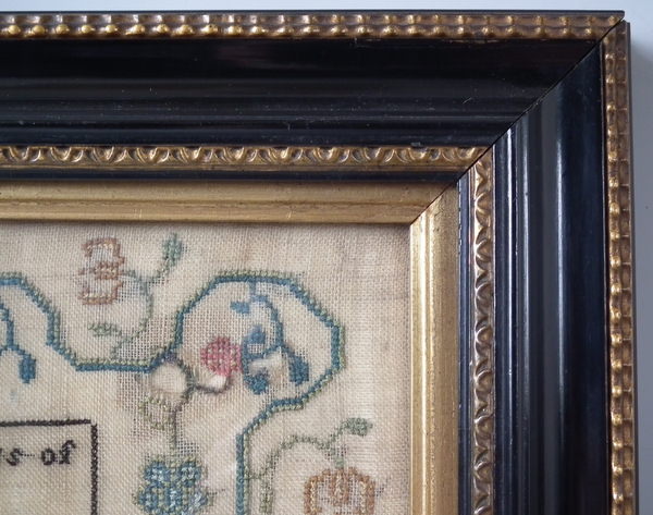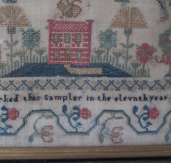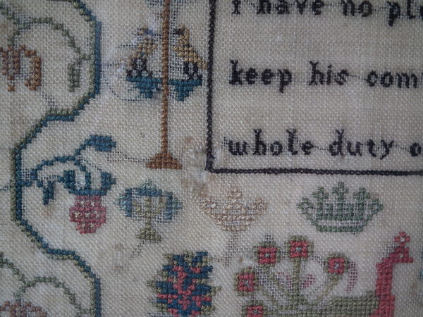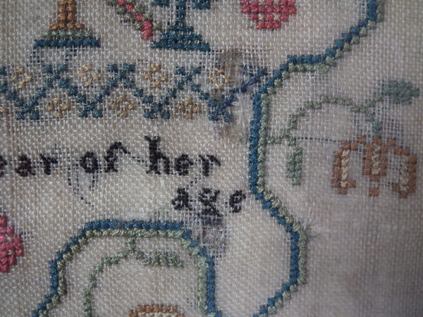 The sampler is worked in silk on linen ground, in a variety of stitches.