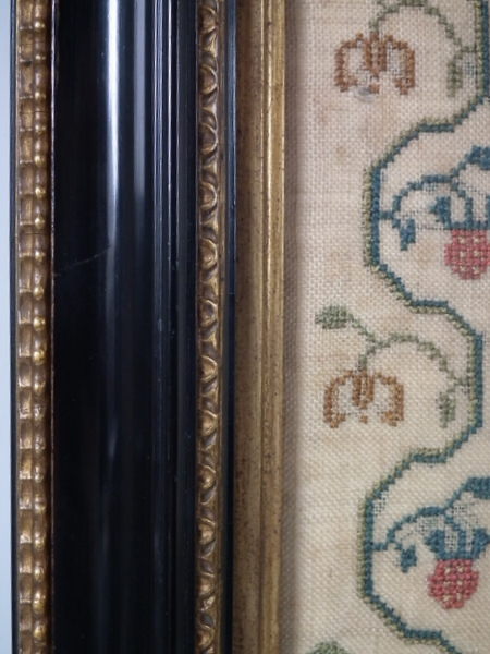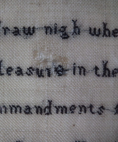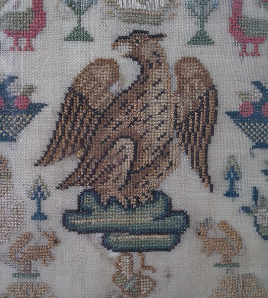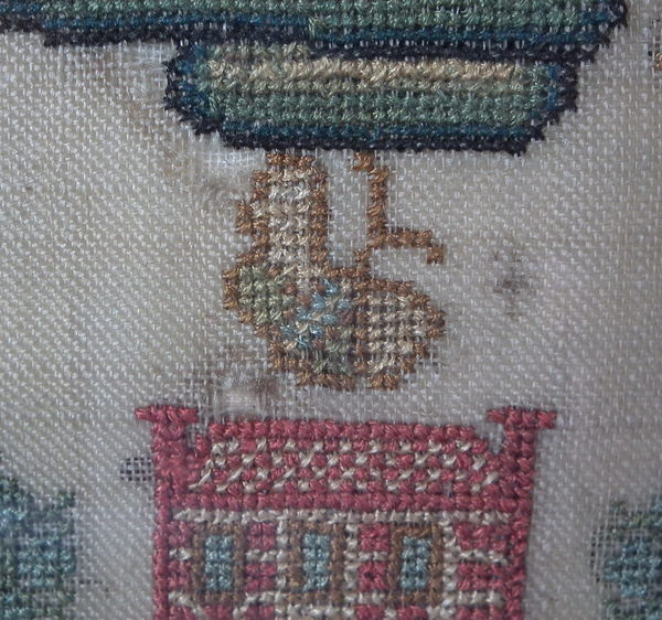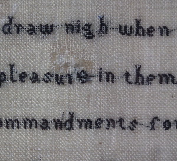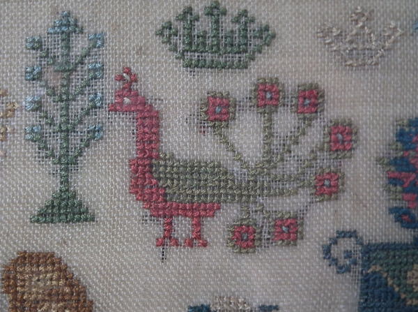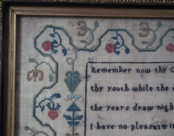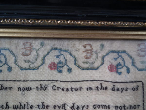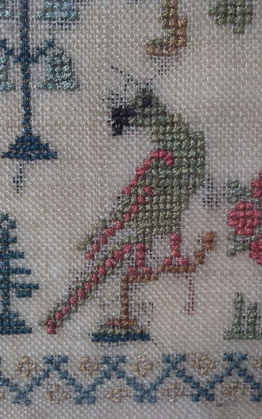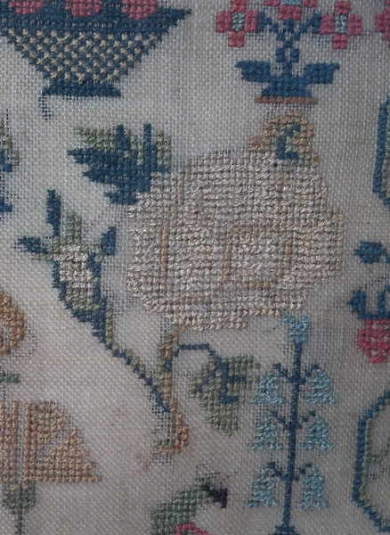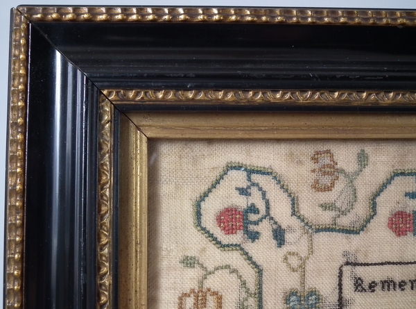 The sampler is worked in silk on linen ground, in a variety of stitches.