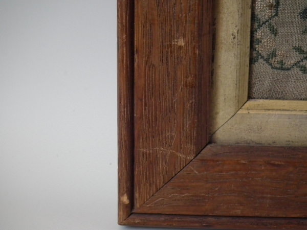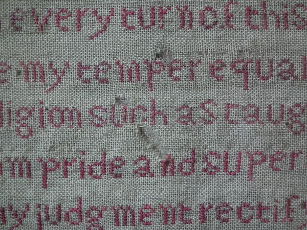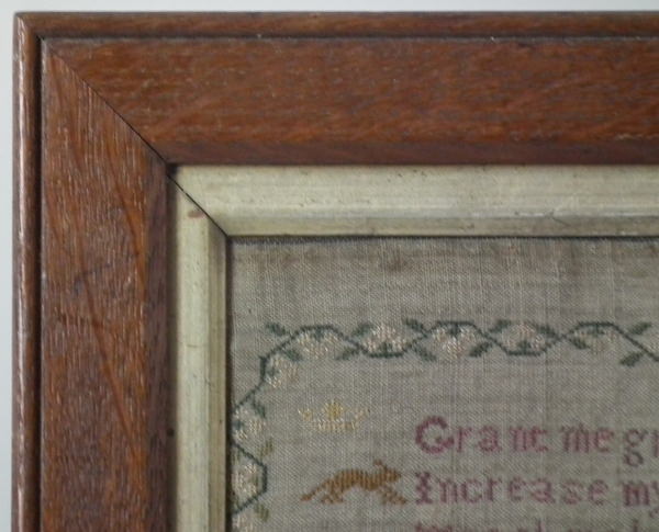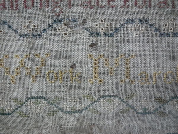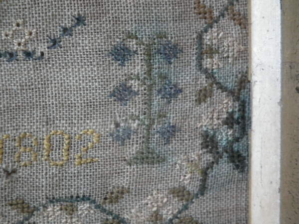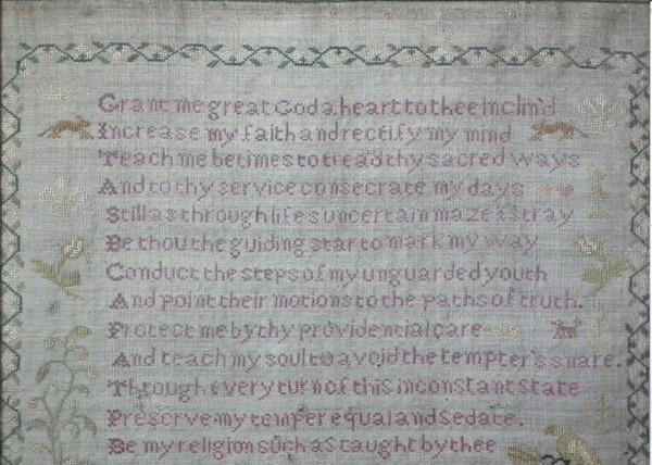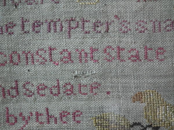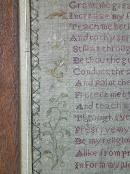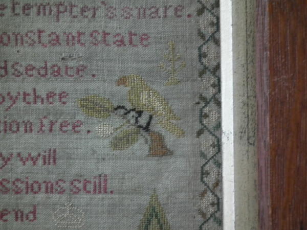 The sampler is worked in silk on linen ground, in a variety of stitches including Algerian eye.