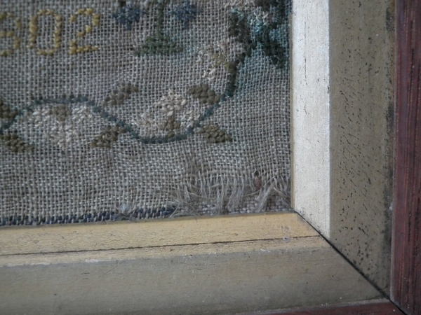 George III, dated 1802. 12.5 ins by 10 ins wide. 1802 Verse Sampler by Mary Cook. Framed in an old wood frame with rippled, old glass.