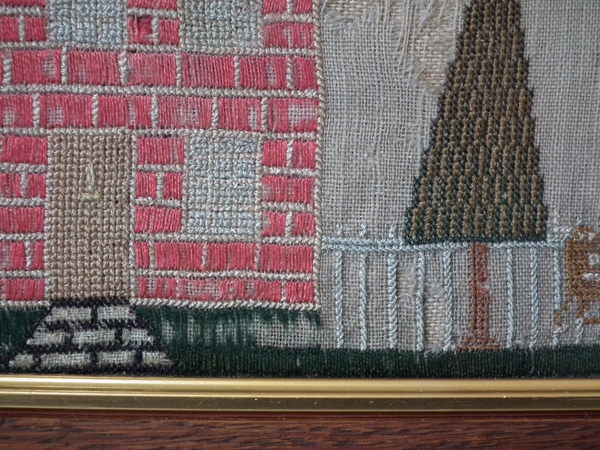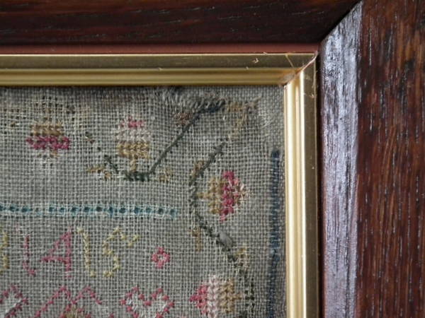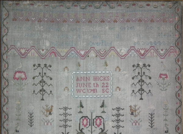 1781 House Sampler by Anne Hicks. Framed in an old wood frame with gilt slip and glass.