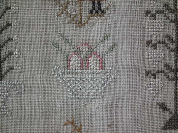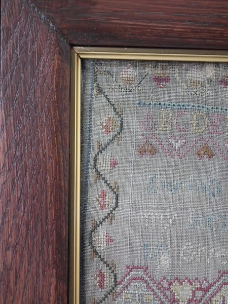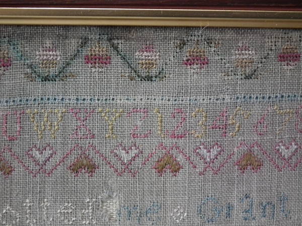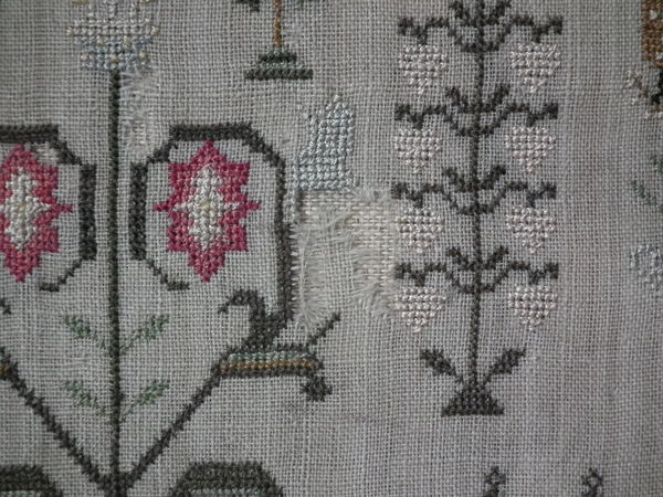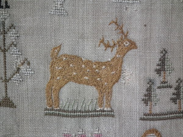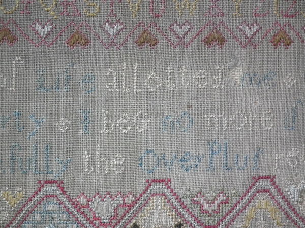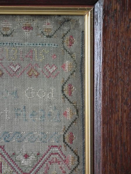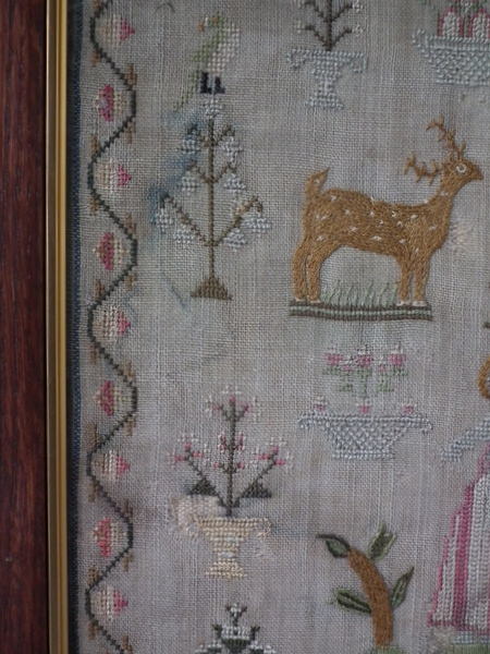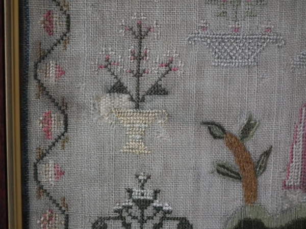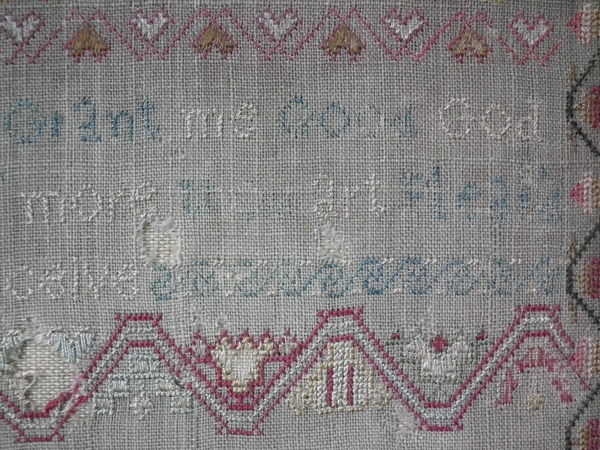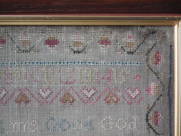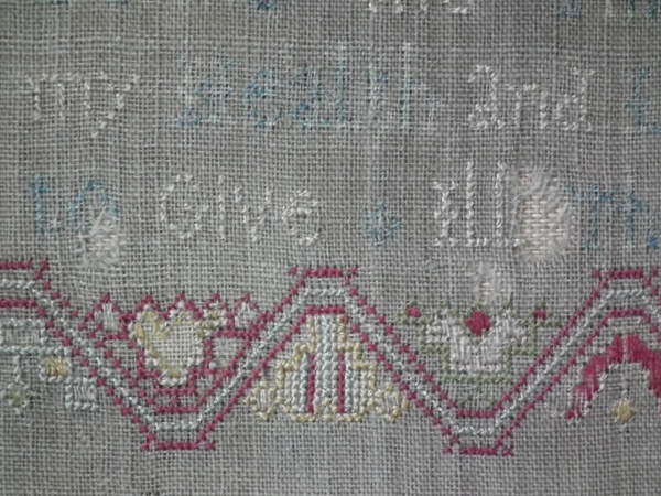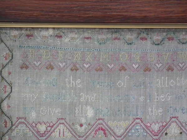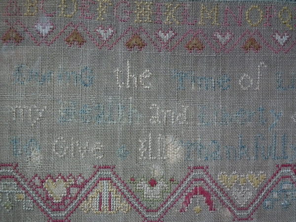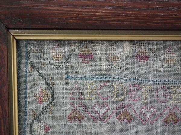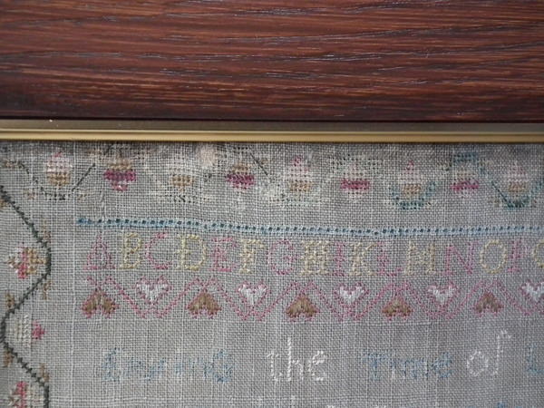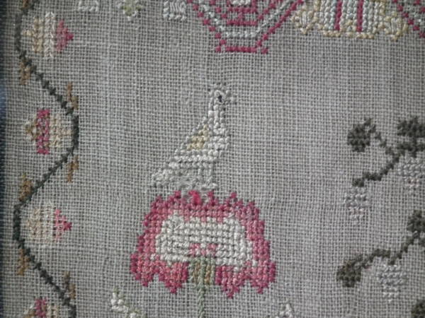 The sampler is worked in silk on linen ground, in a variety of stitches.