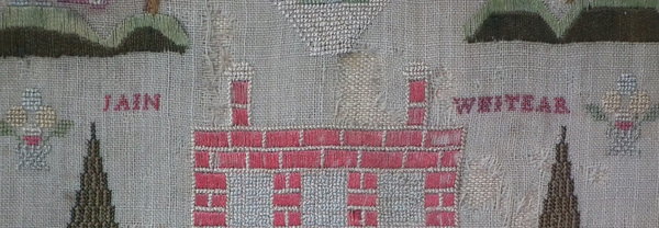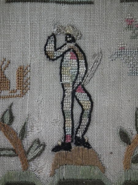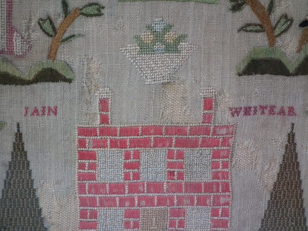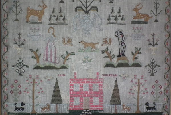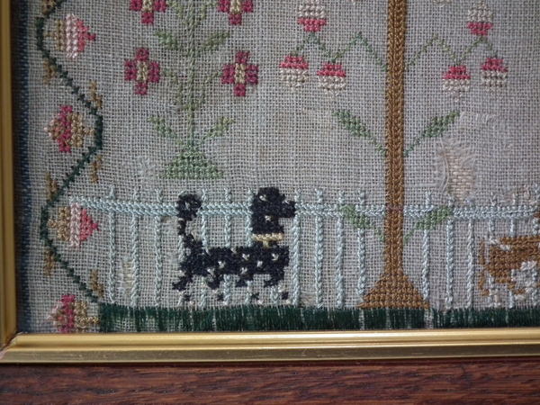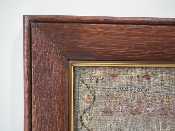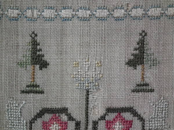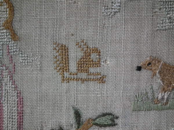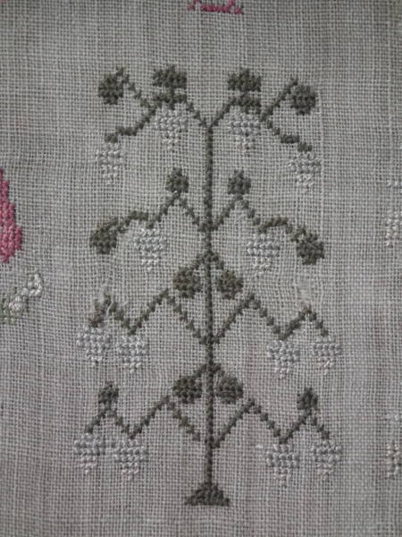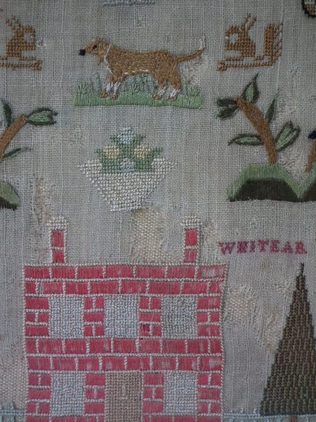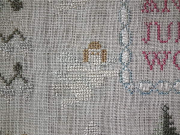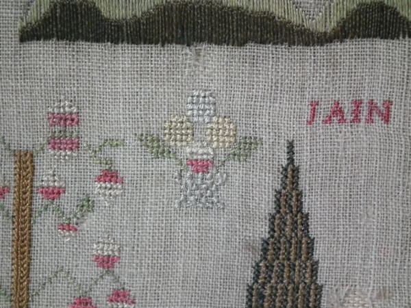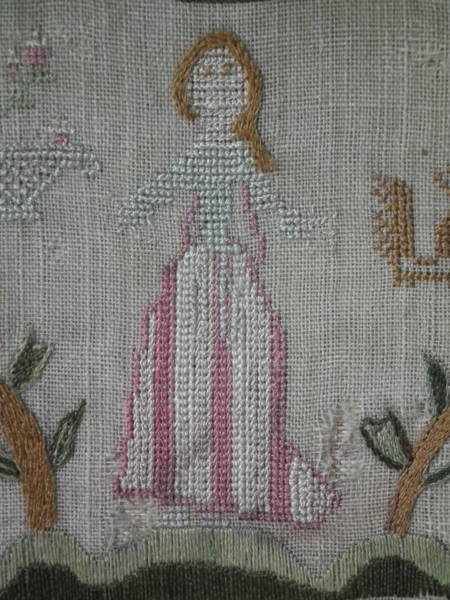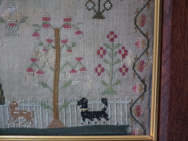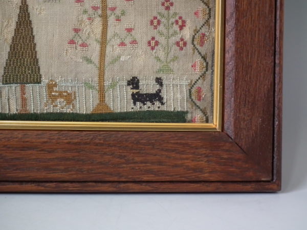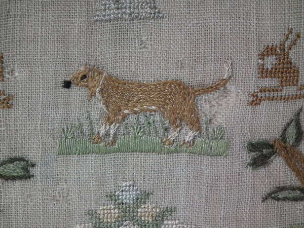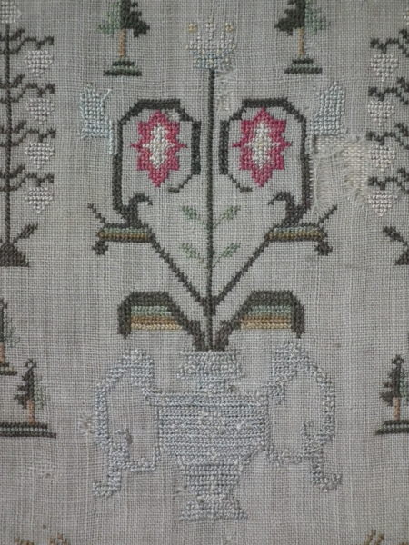 The sampler is worked in silk on linen ground, in a variety of stitches.
