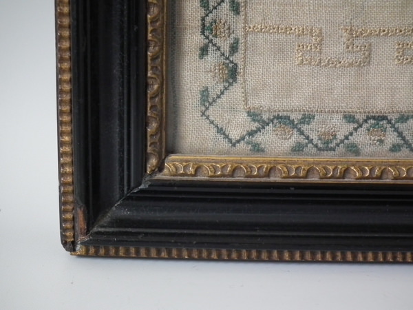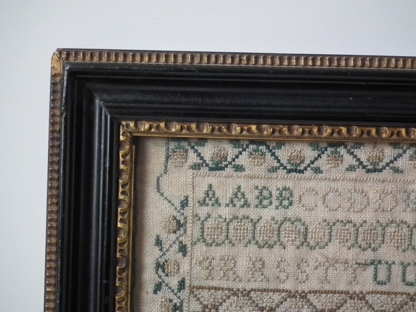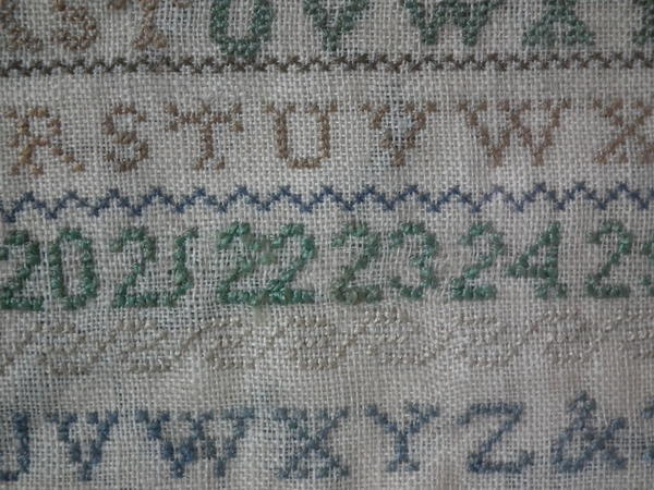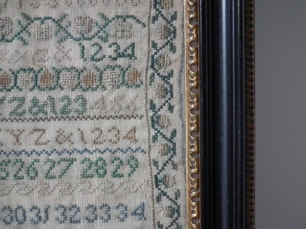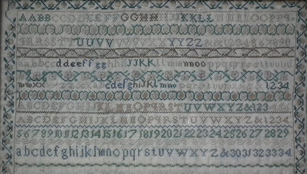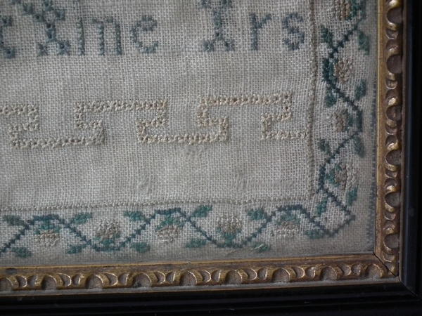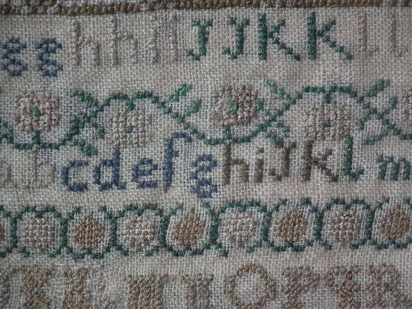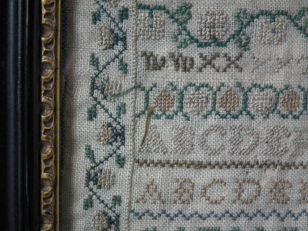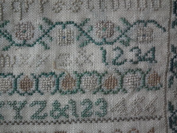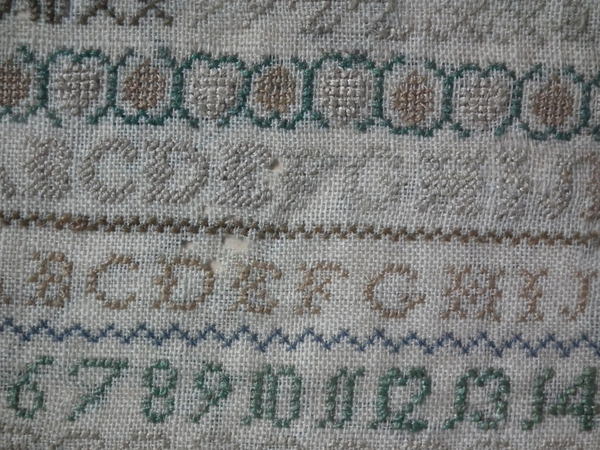 The sampler is worked in silk on linen ground, in cross stitch and Algerian eye.