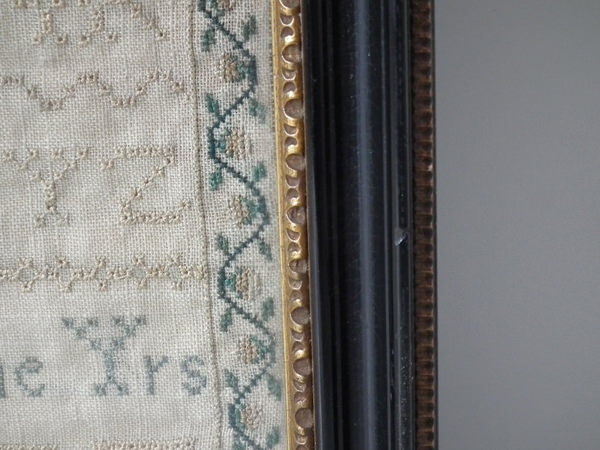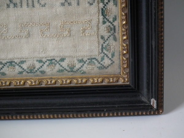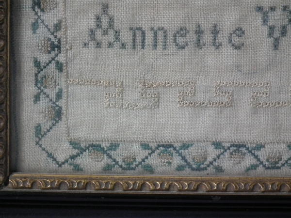 Victorian, dated 1843. 13.5ins by 12.75ins wide. 1843 Sampler by Annette Warrington. Framed in an old, possibly original, Hogarth frame with rippled, old glass.