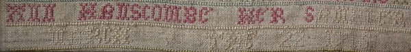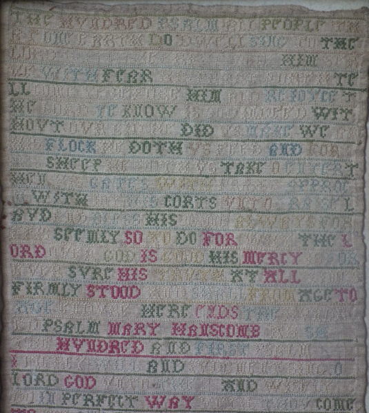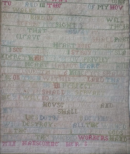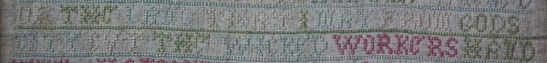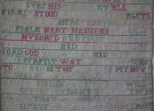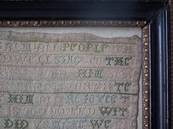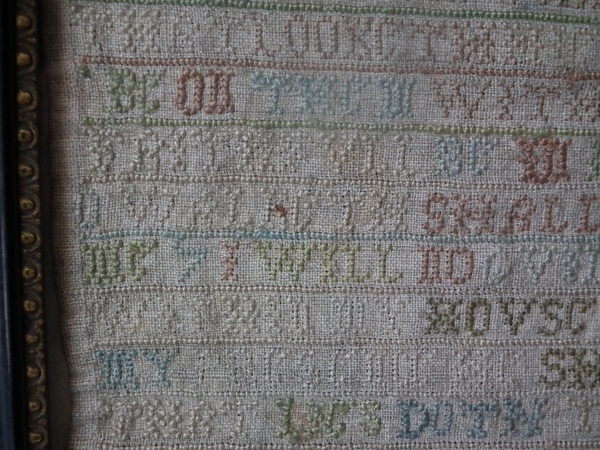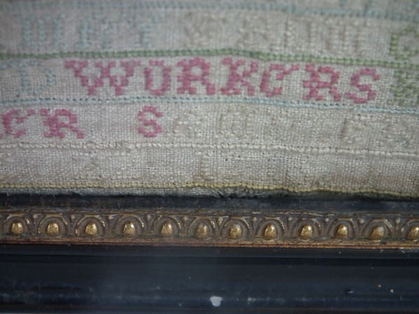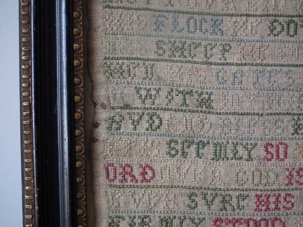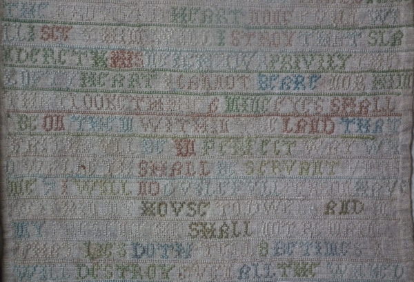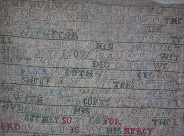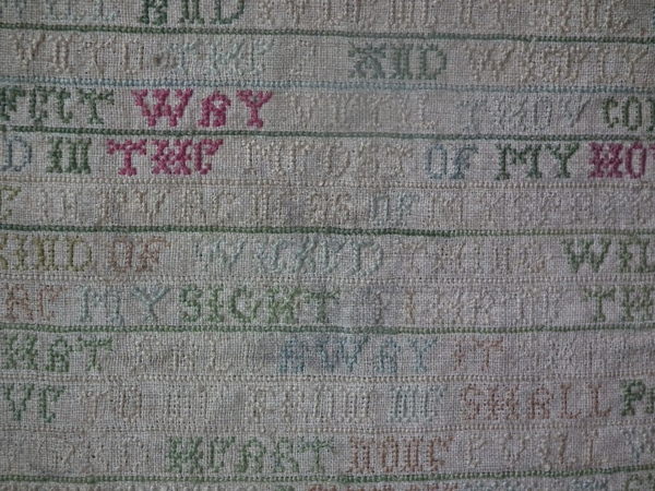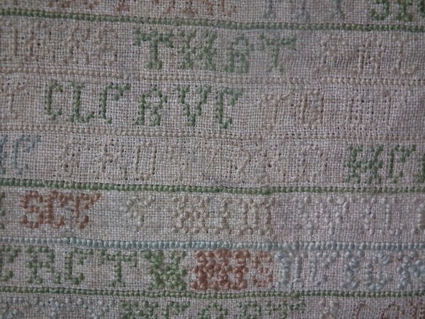 The sampler is worked in a silk-like thread on linen ground, in cross stitch throughout.