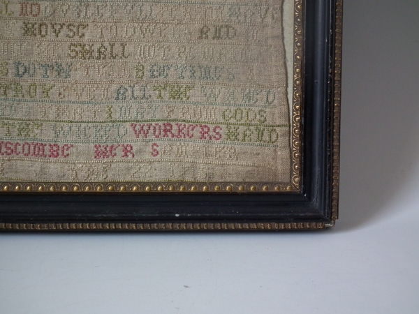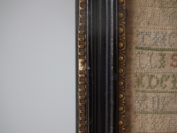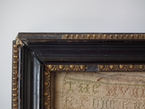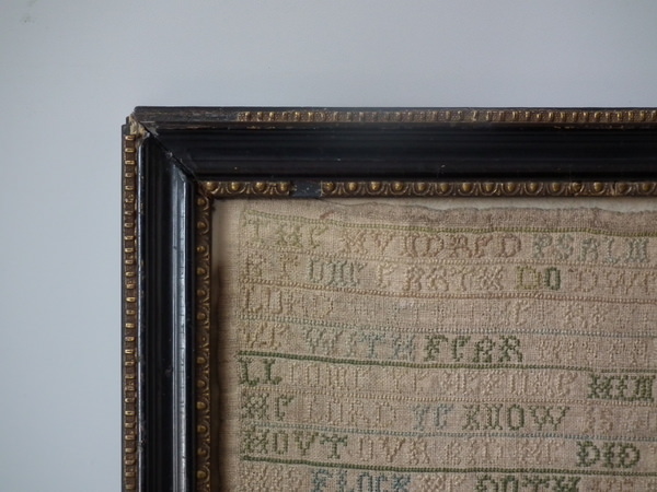 1716 sampler by Ann Hanscombe. Framed in an old Hogarth frame with rippled, old glass.