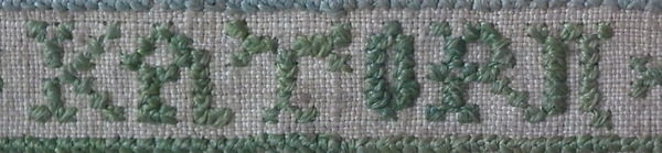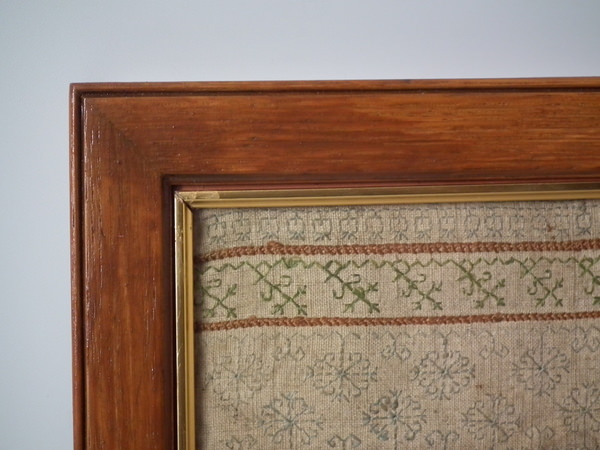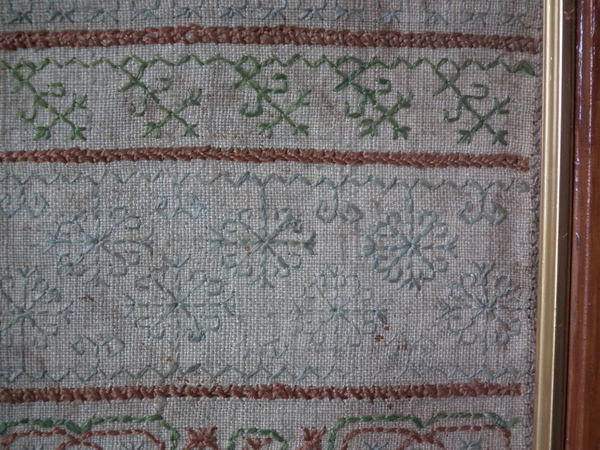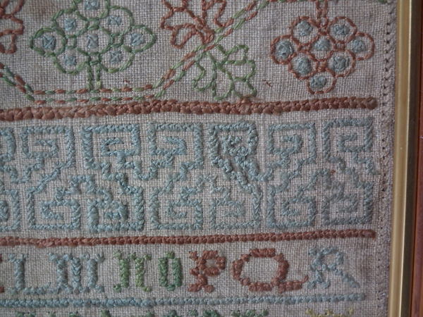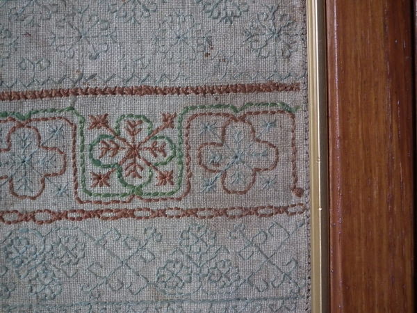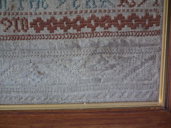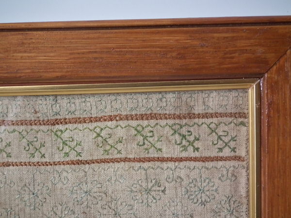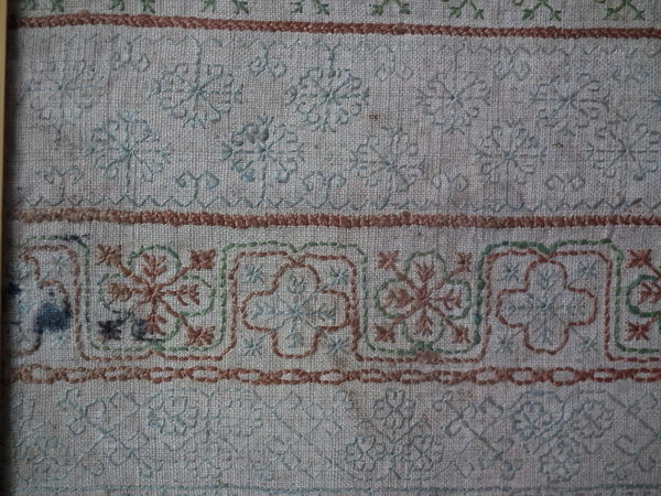 The sampler is worked in silk and cotton on linen ground, in a variety of stitches including Algerian eye.