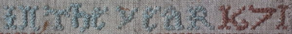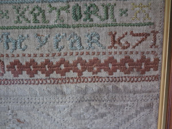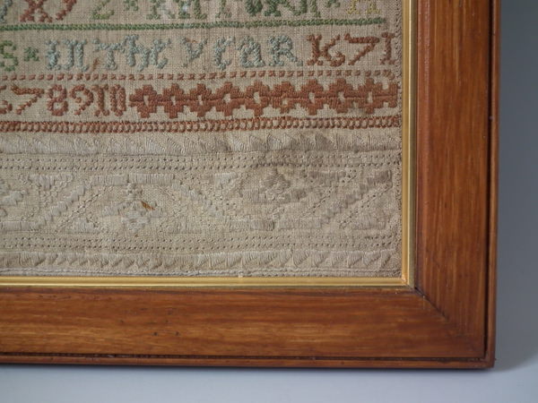 Late 17thC, dated 1671. 11.25ins by 7.25ins wide. 1671 Sampler by Katorn Noyes. Framed in an old wood frame with gilt slip and glass.