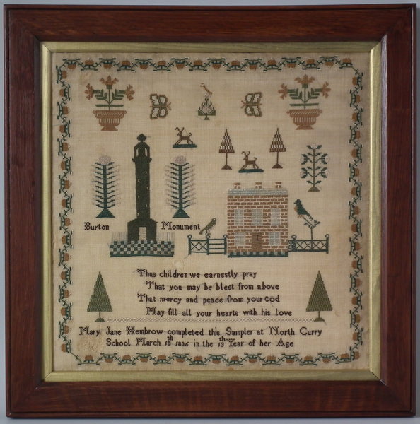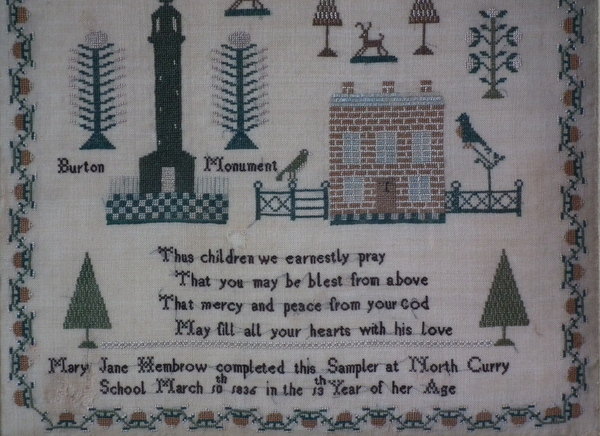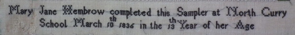 'Mary Jane Hembrow completed this Sampler at North Curry School March 10th 1836 in the 13th Year of her Age'.