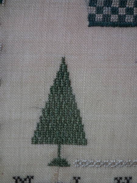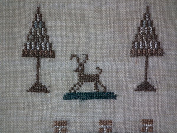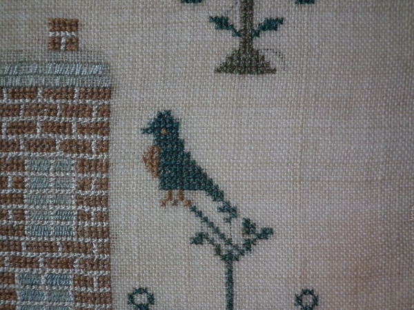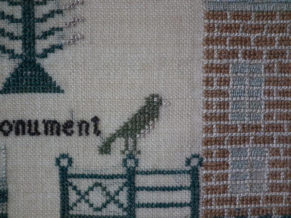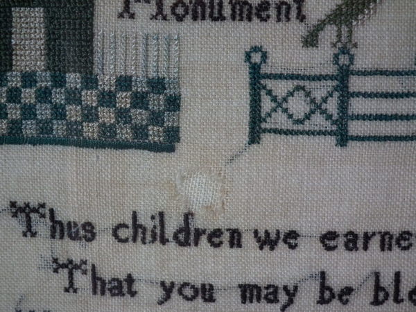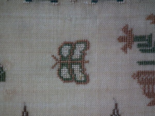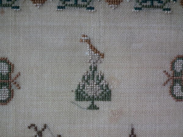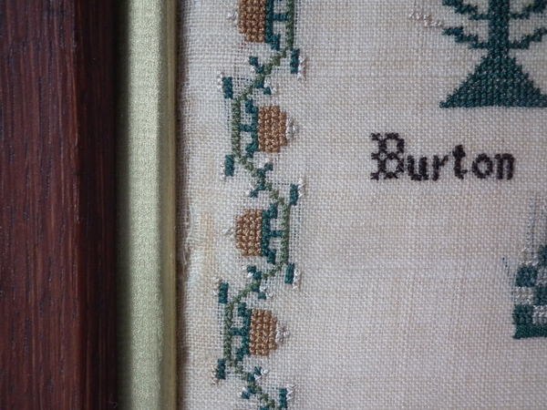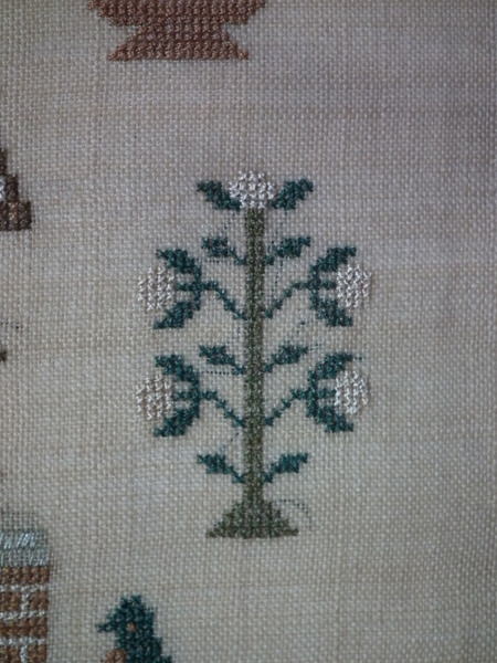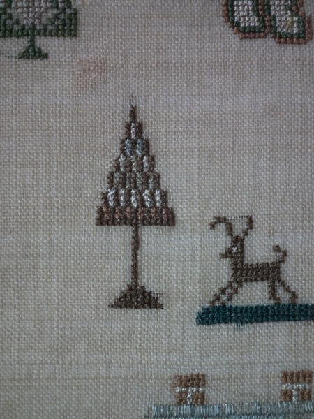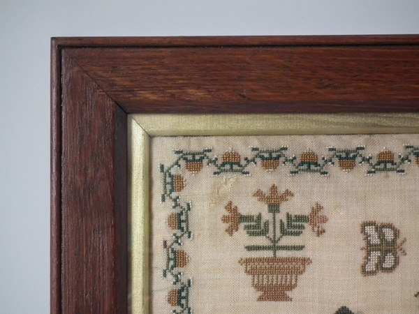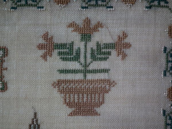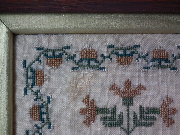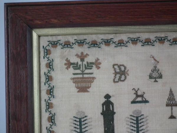 The sampler is worked in silk on linen ground, in a variety of stitches.