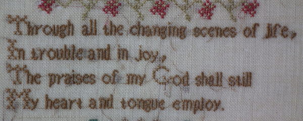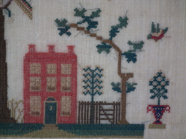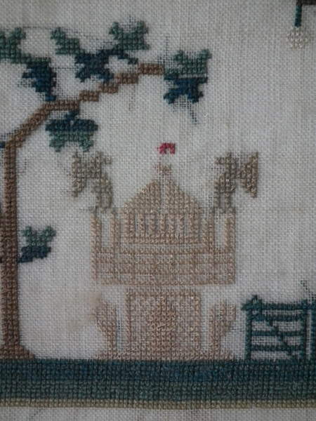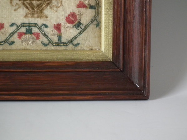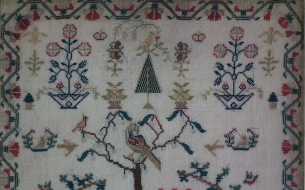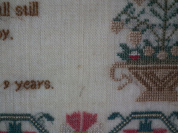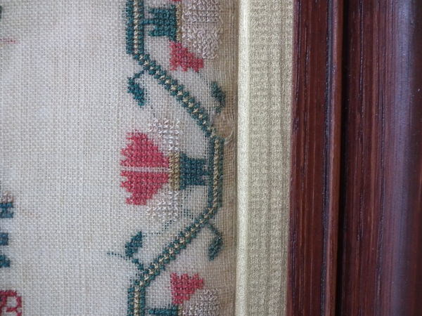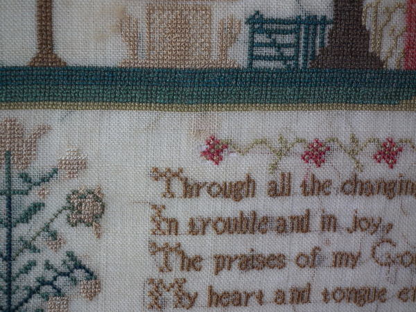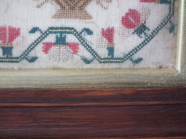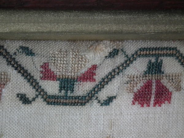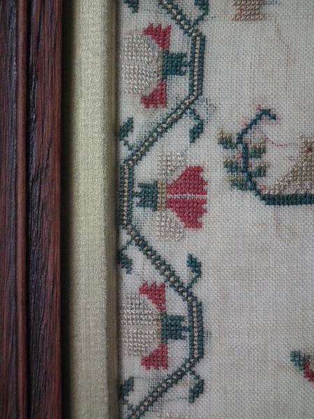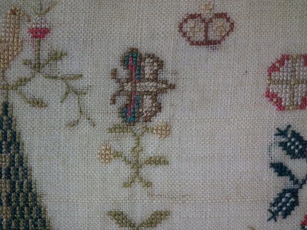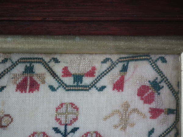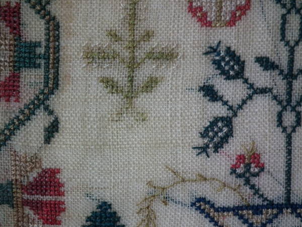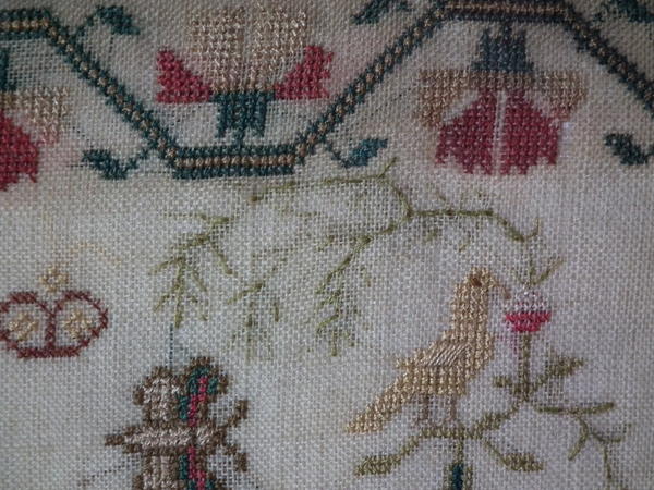 The sampler is worked in silk on linen ground, in a variety of stitches.