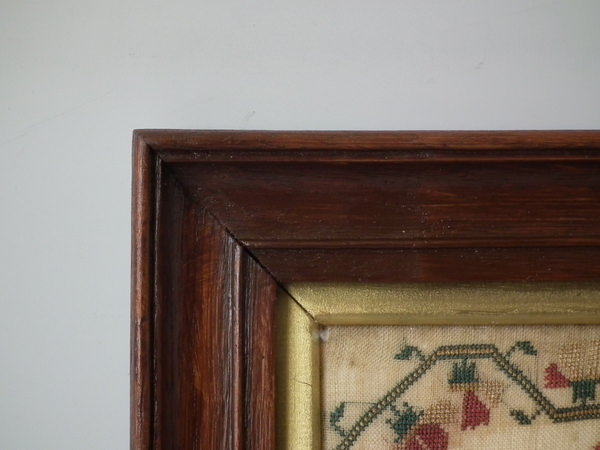 1850 Sampler by Isabella Lickfold. Framed in an old wood frame with gilt slip and glass.