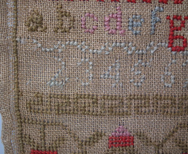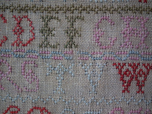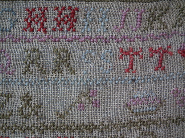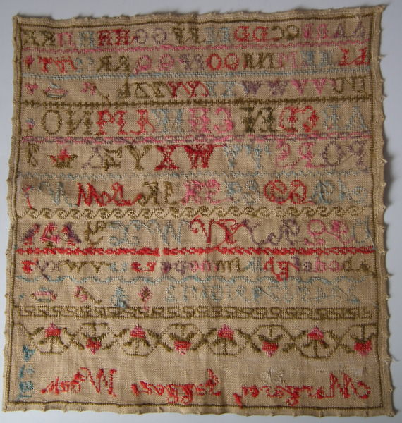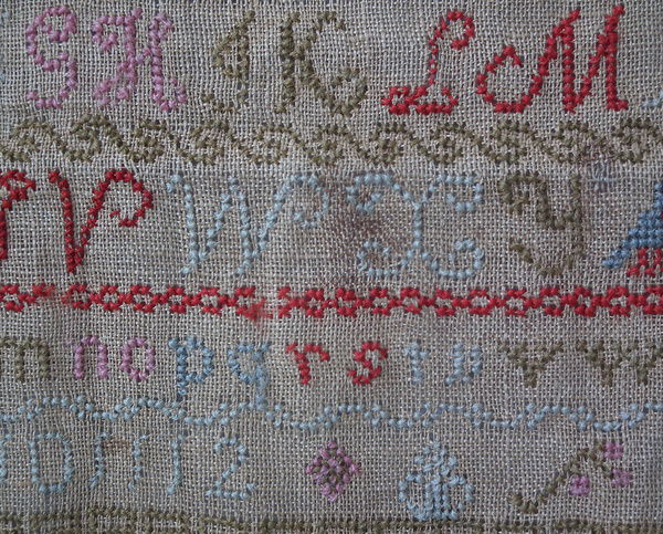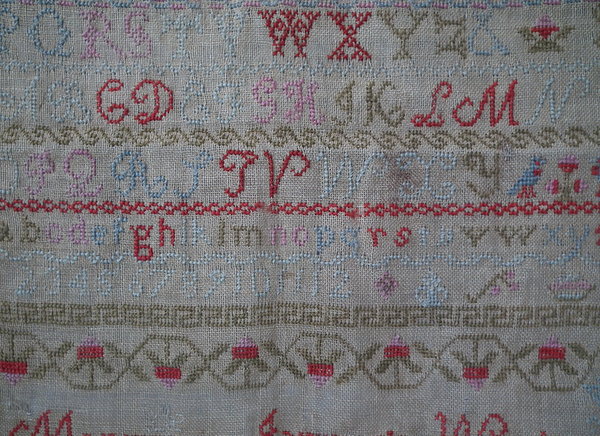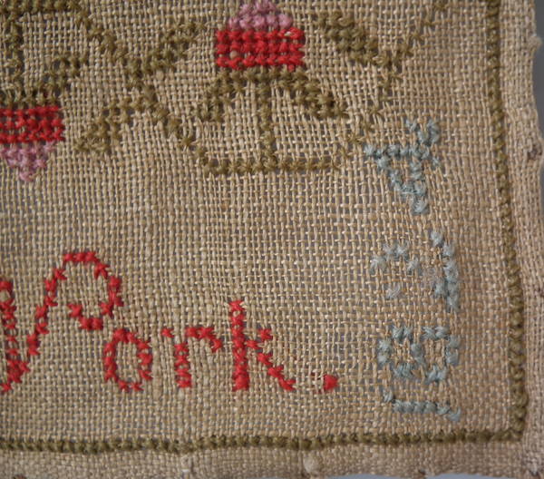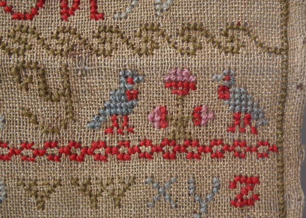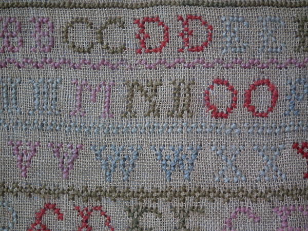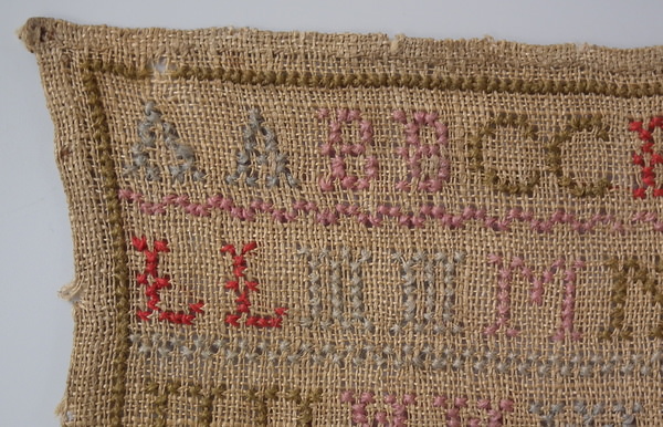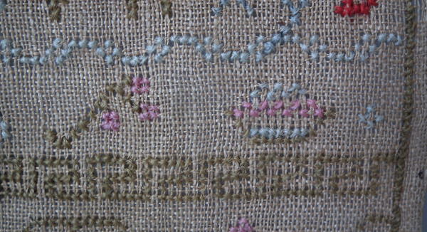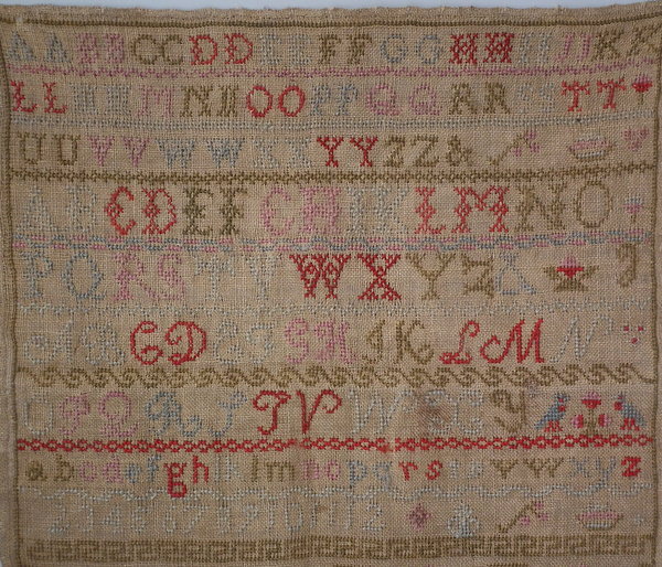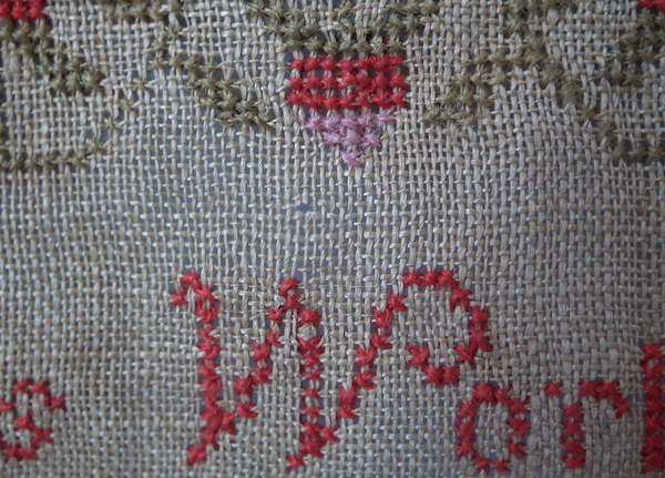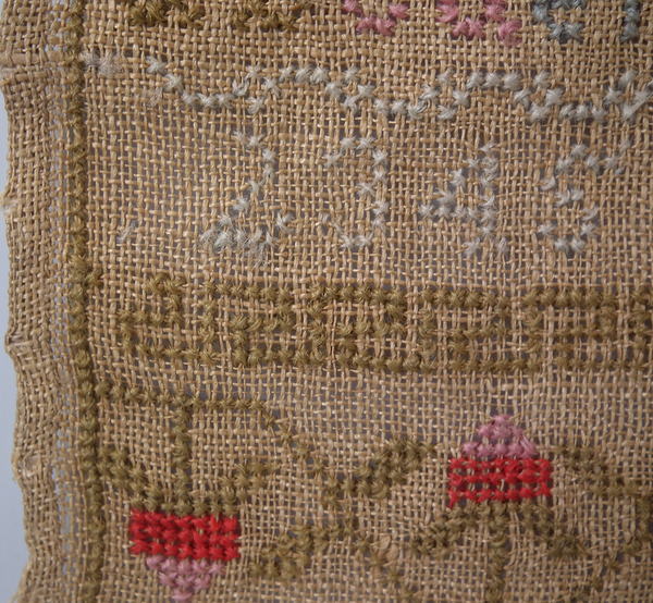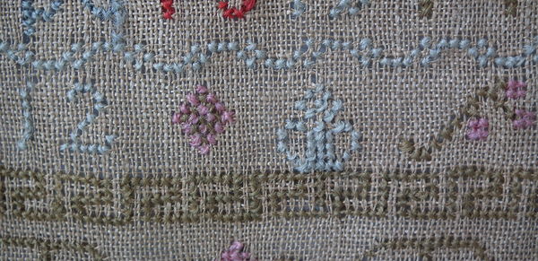 The sampler is worked in fine wool on canvas ground, in cross stitch throughout.