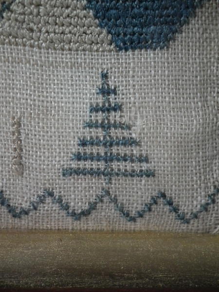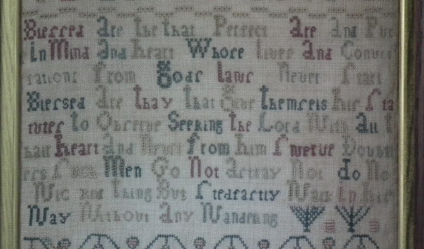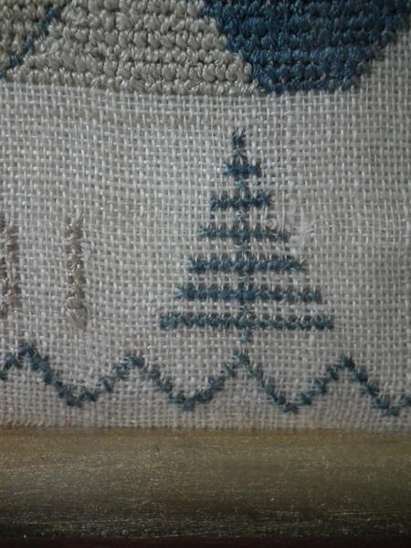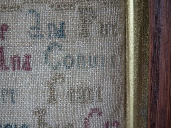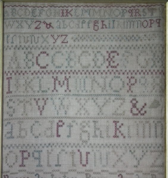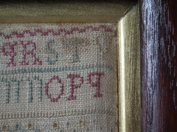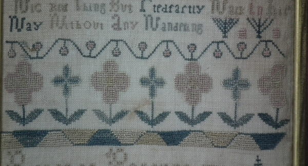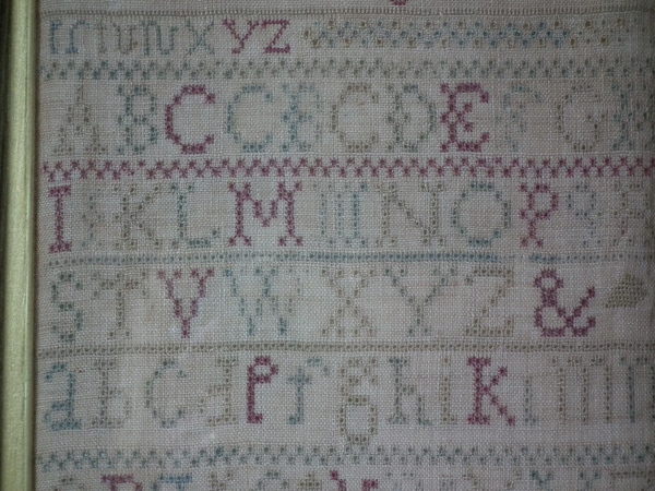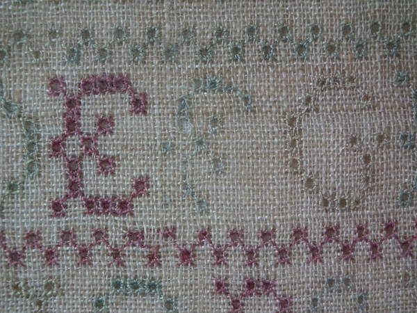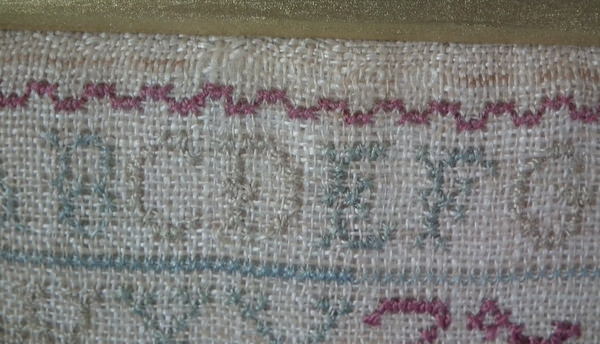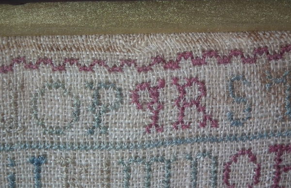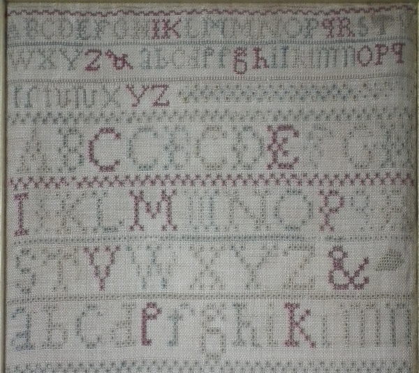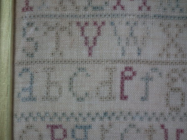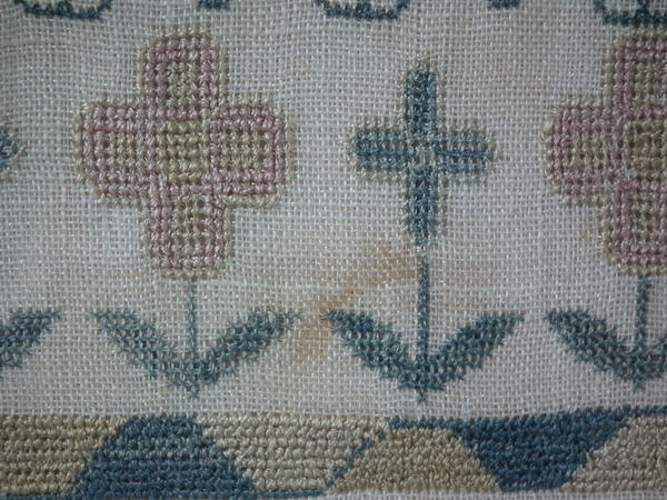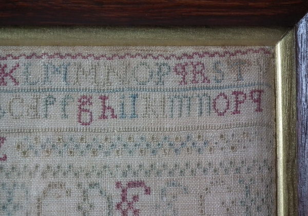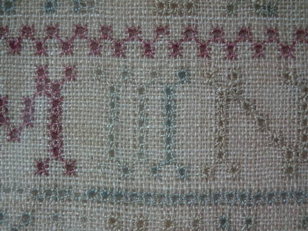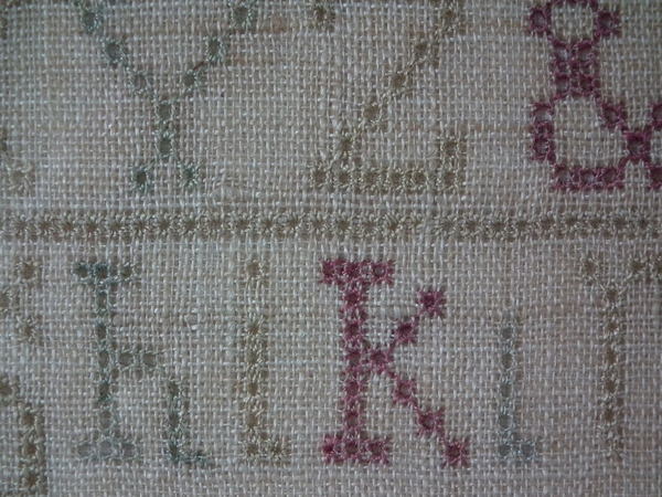 The sampler is worked in a silk-like thread on linen ground, in cross stitch and Algerian eye.