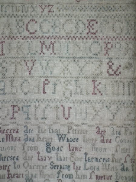 Minor stitch losses to letters of the alphabets, divider lines and verse.