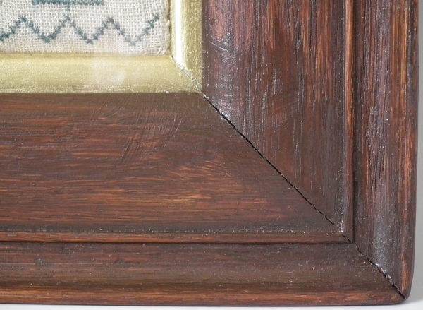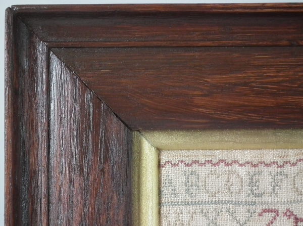 George II, dated 1731. 17.25ins by 8ins wide. 1731 Band Sampler by Rebekah Parsons. Framed in an old wood frame with gilt slip and glass.