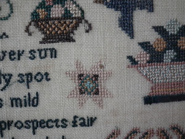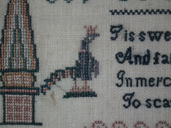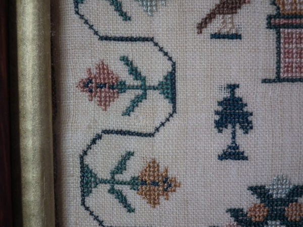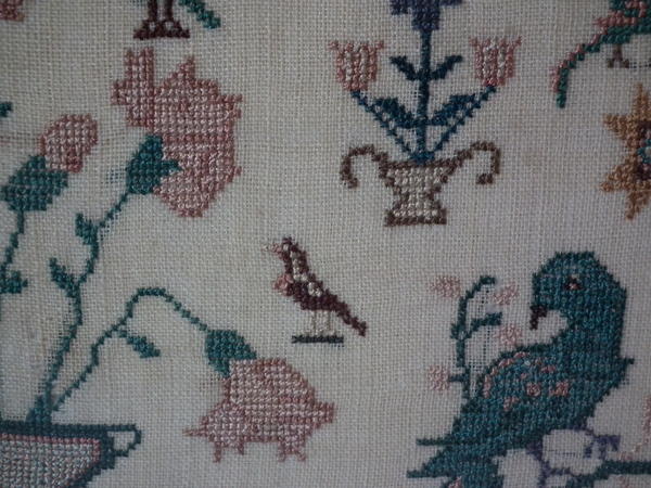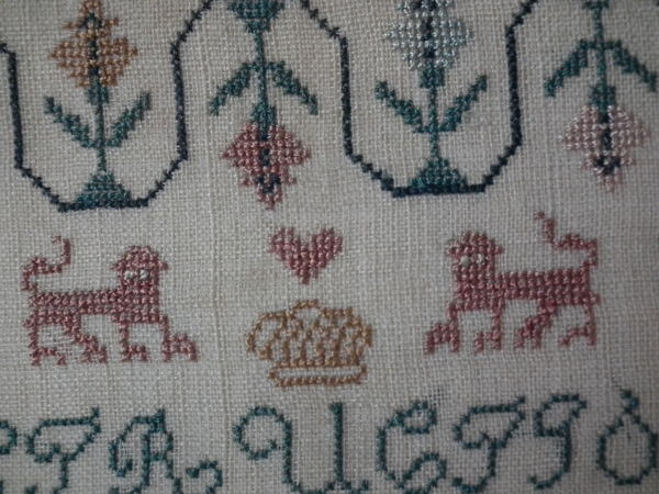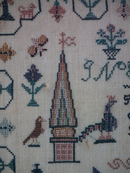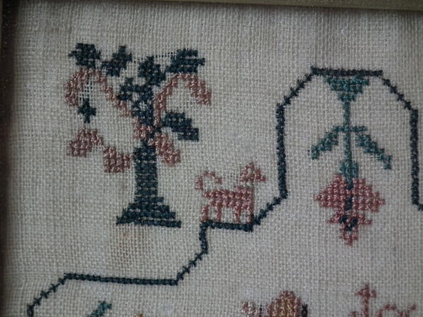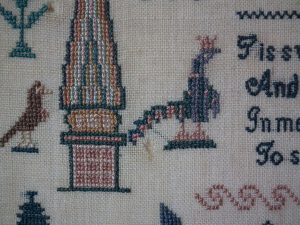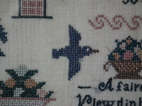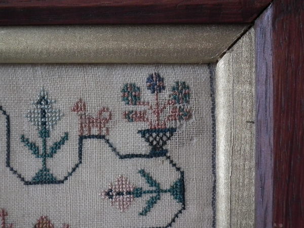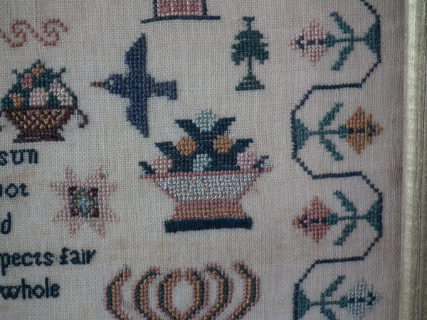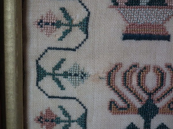 The sampler is worked in silk on linen ground, in a variety of stitches.