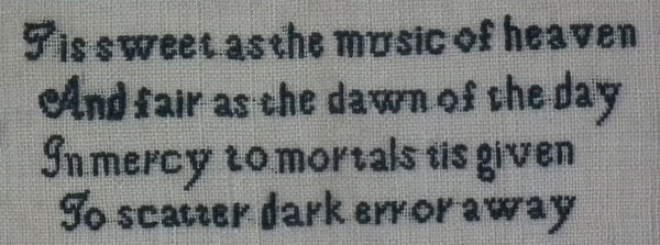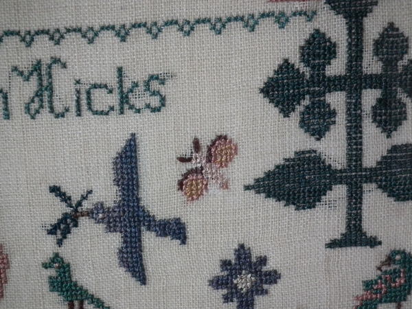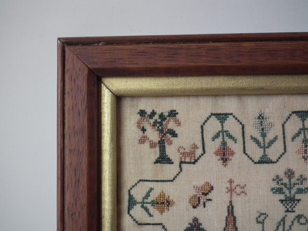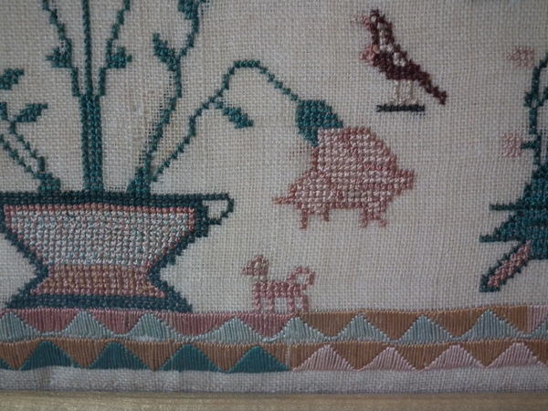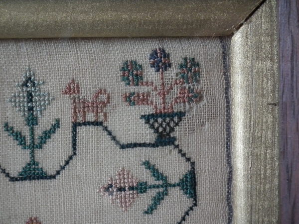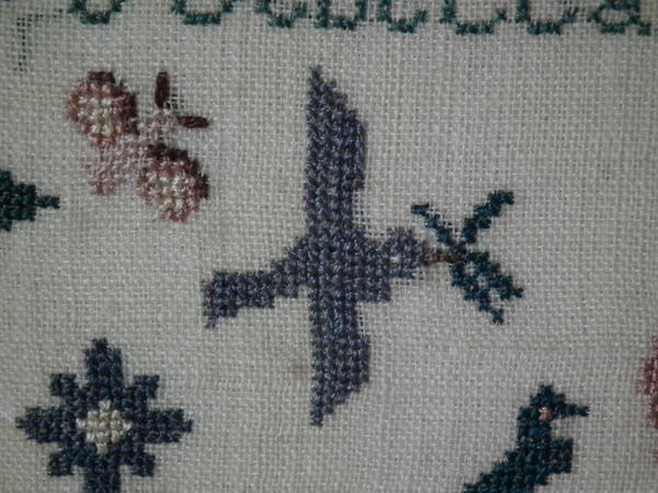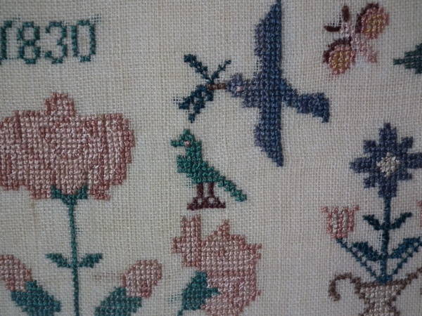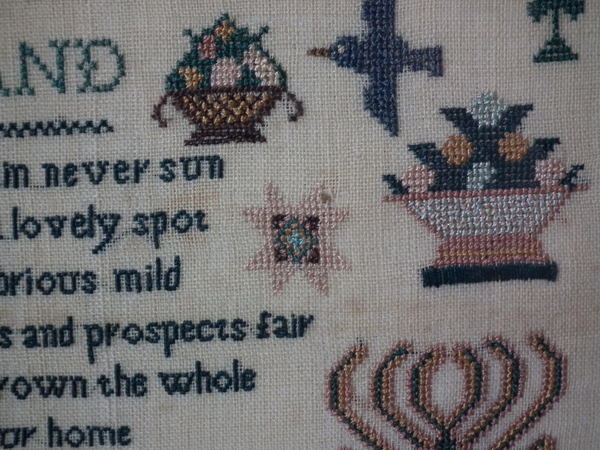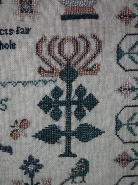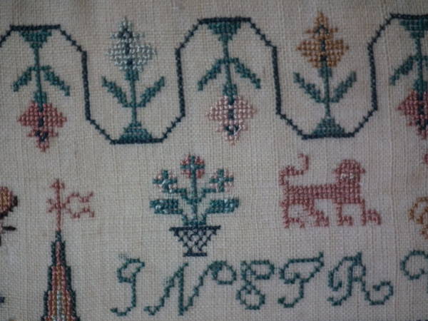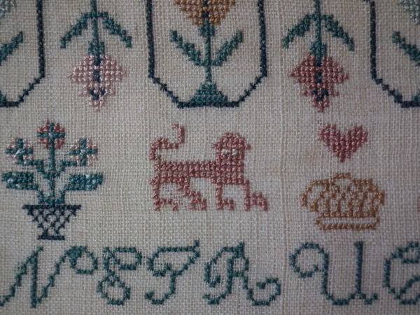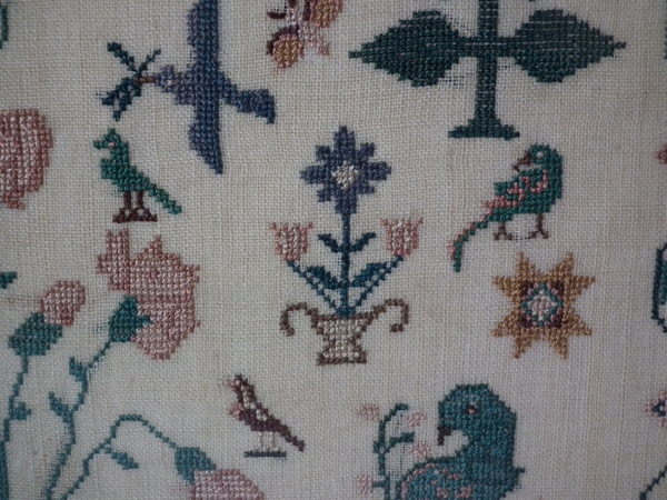The sampler is worked in silk on linen ground, in a variety of stitches.