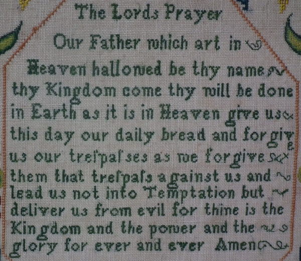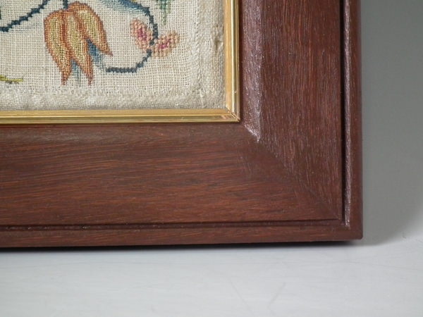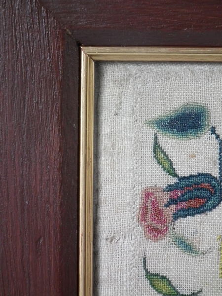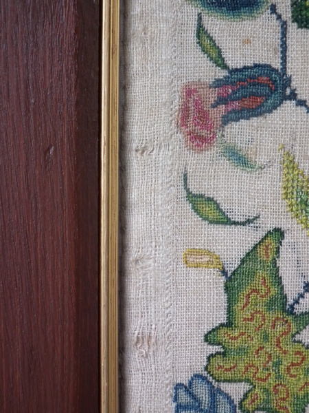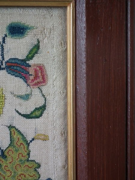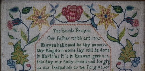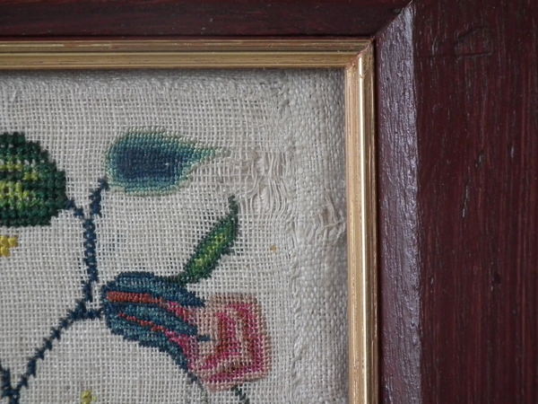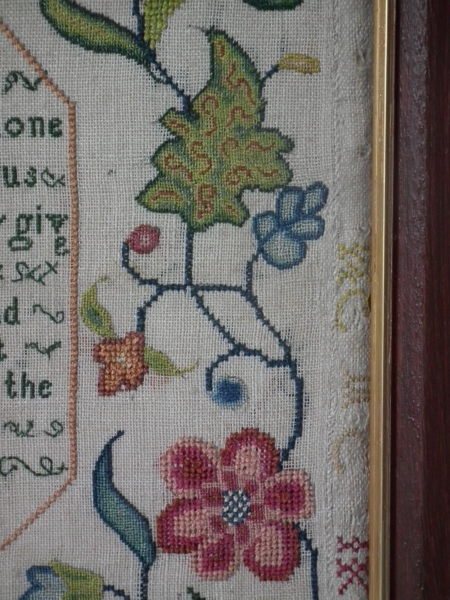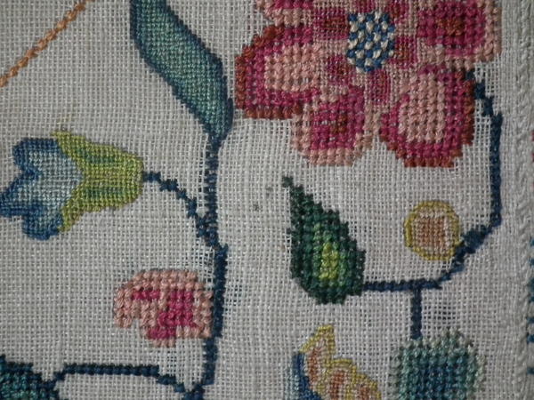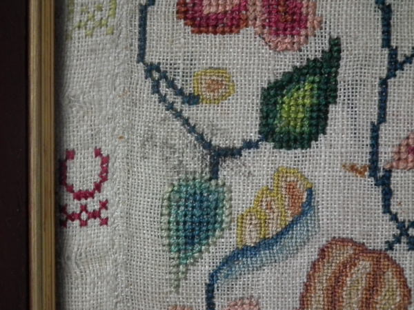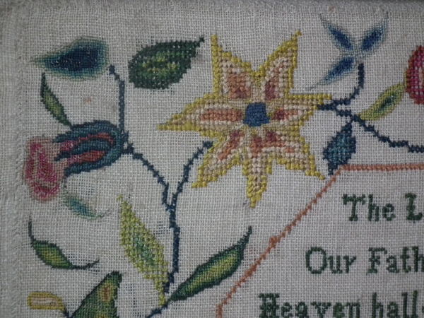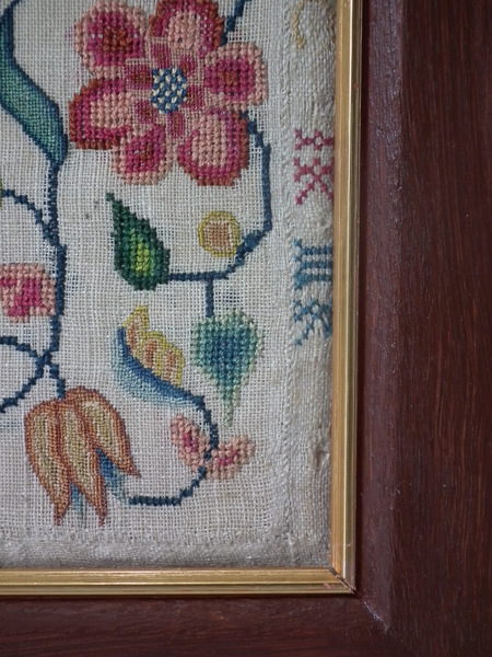 The sampler is worked in silk on linen ground, in cross stitch throughout.