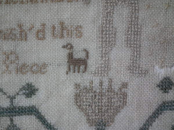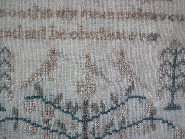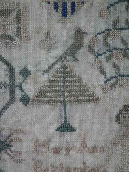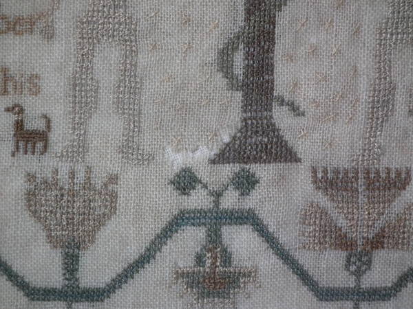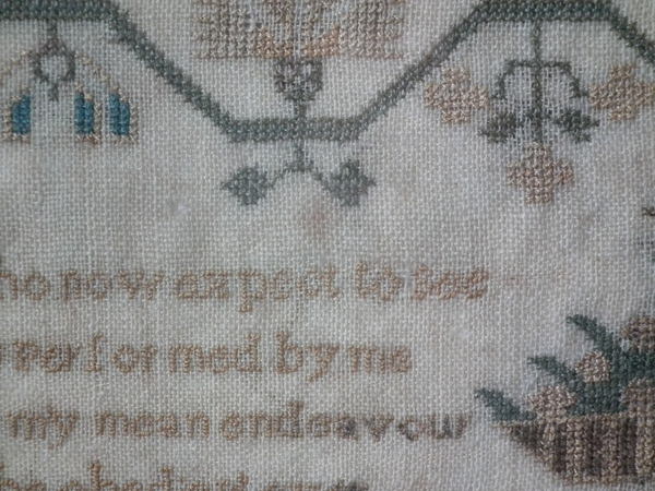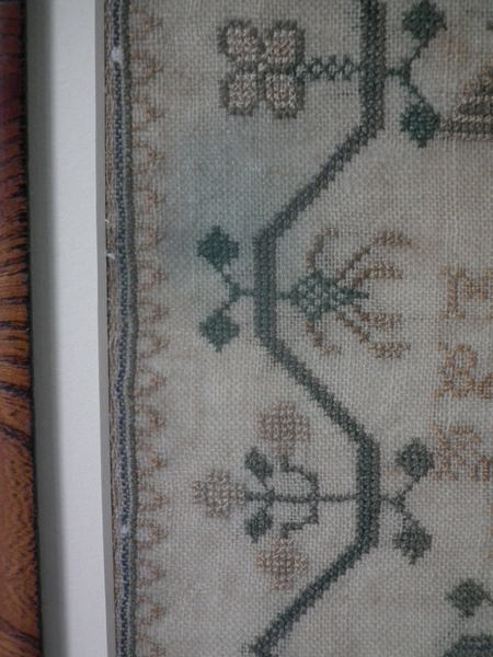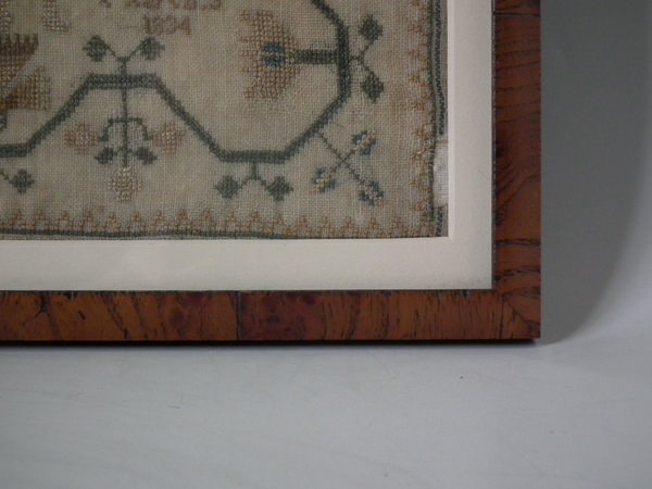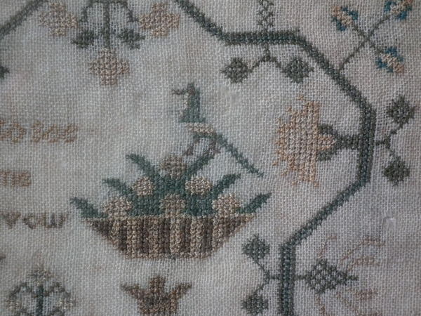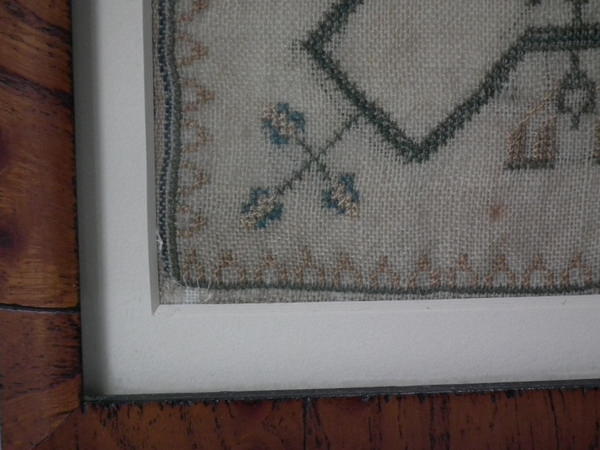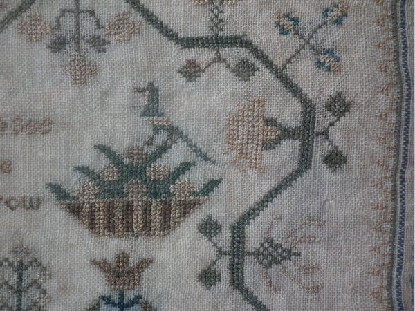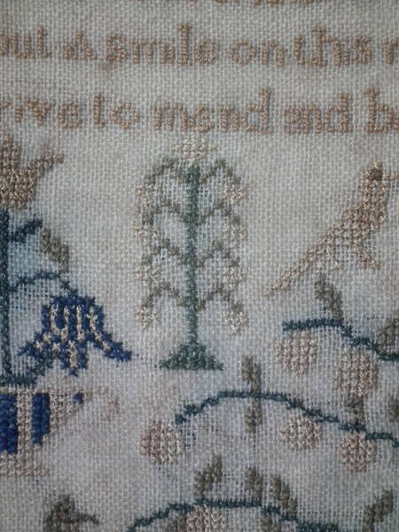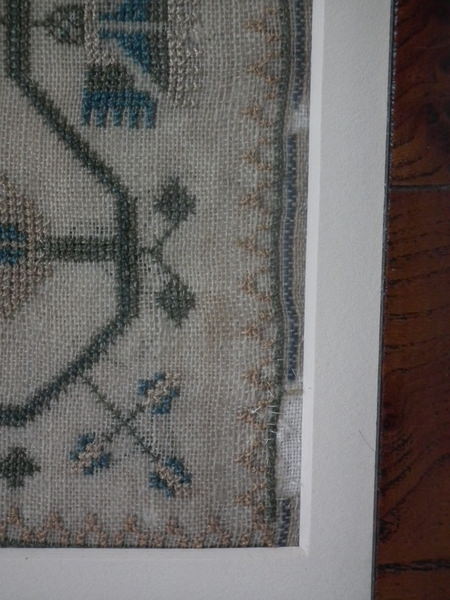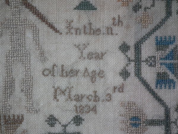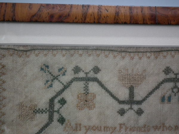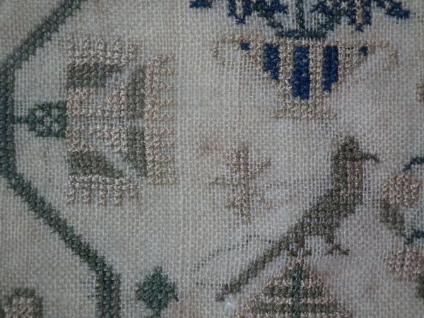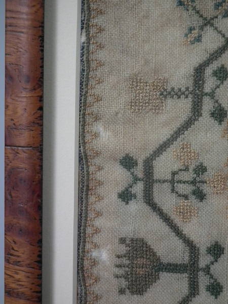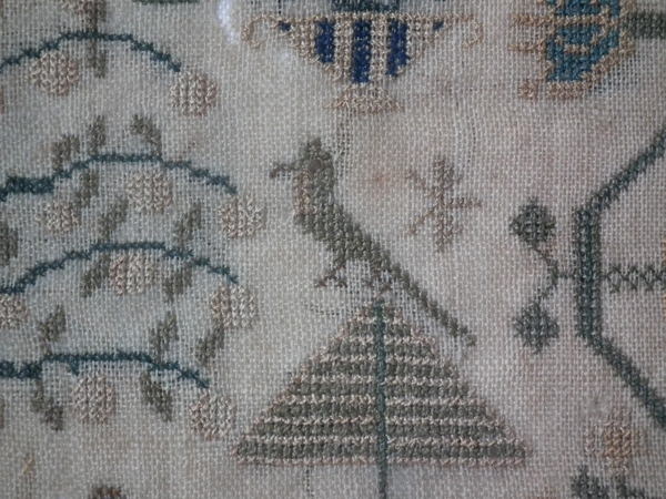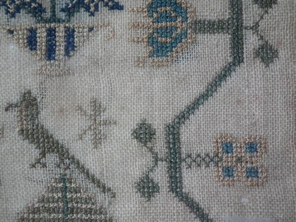 The sampler is worked in silk on linen ground, in cross stitch throughout.