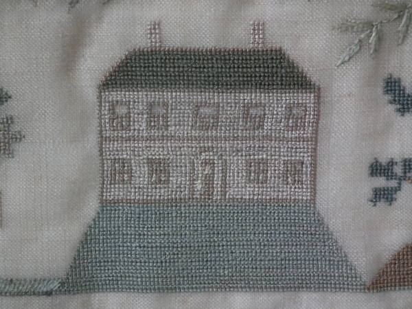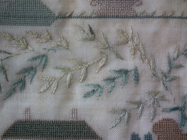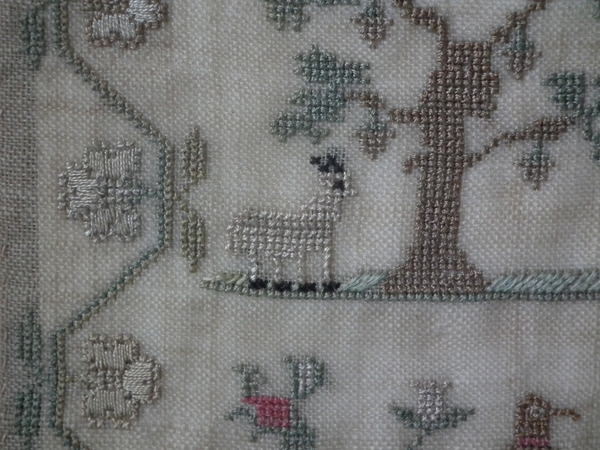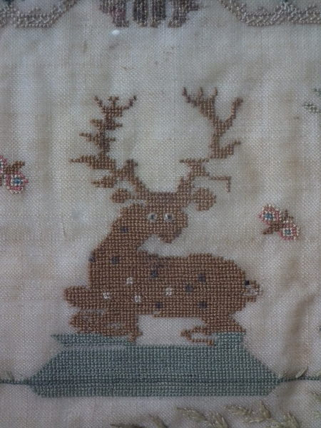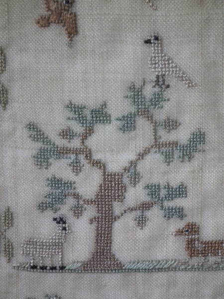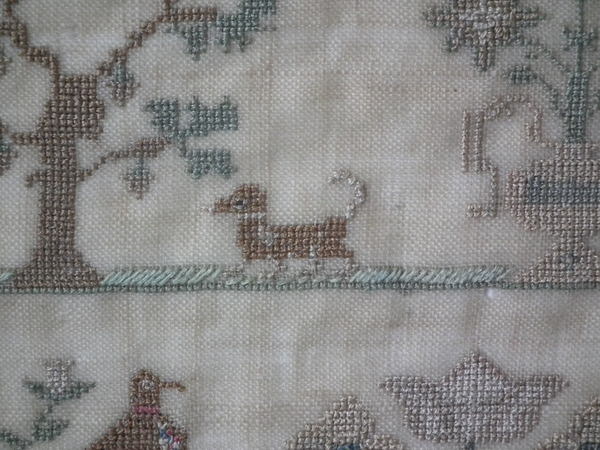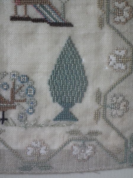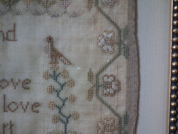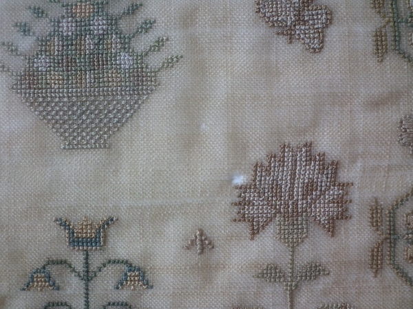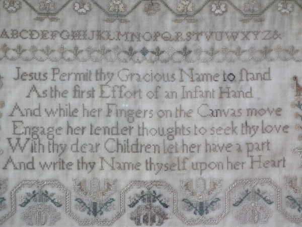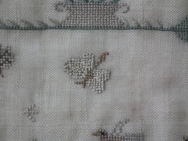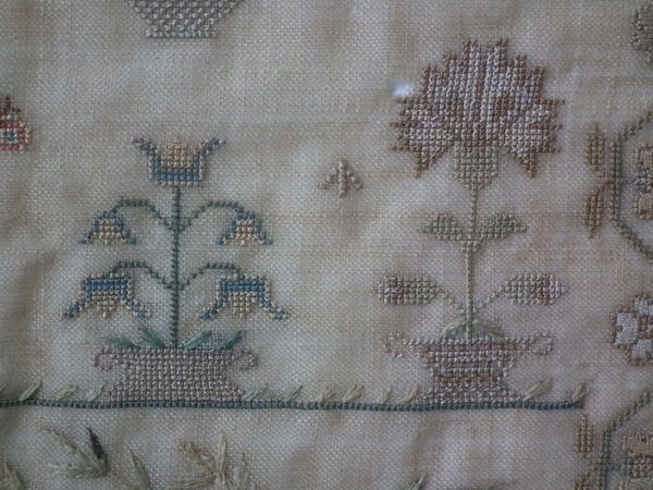 The sampler is worked in silk on linen ground, in a variety of stitches.