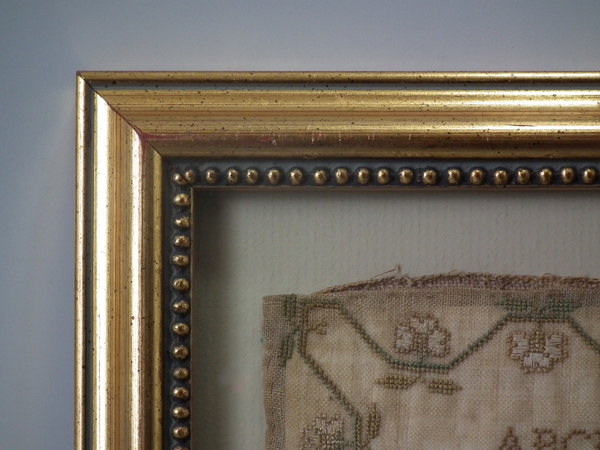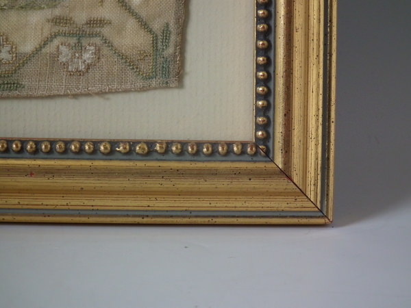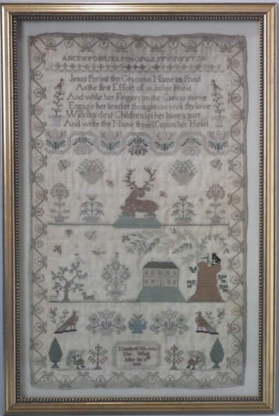 1823 House Sampler by Elizabeth Woolvin. Framed in a modern gilt frame with glass.