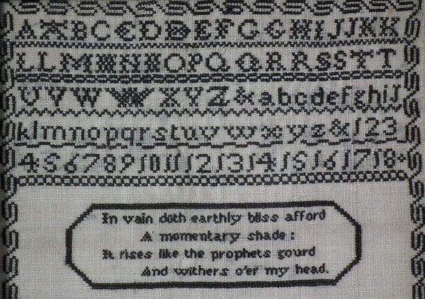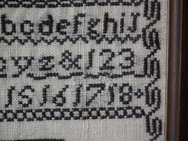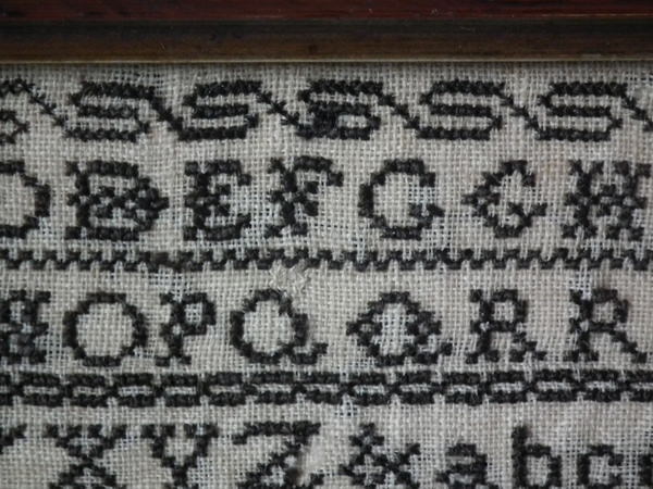 The sampler is worked in a cotton-like thread on linen ground, in cross stitch throughout.
