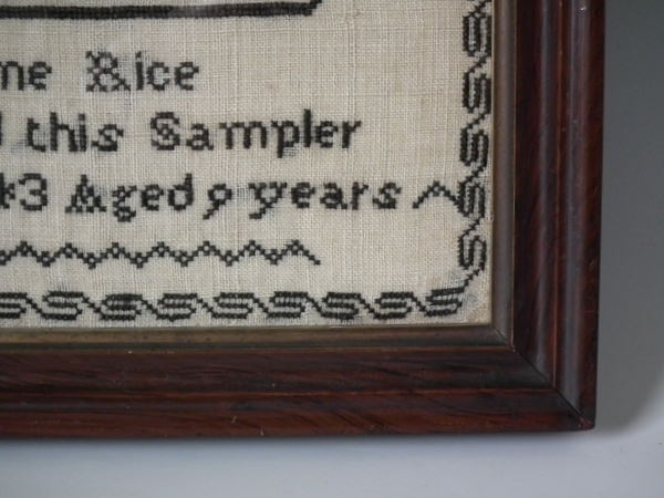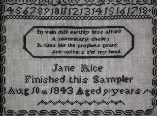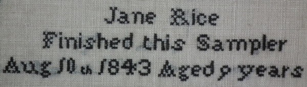 'Jane Rice Finished this Sampler Aug 10th 1843 Aged 9 years'.