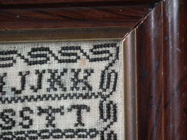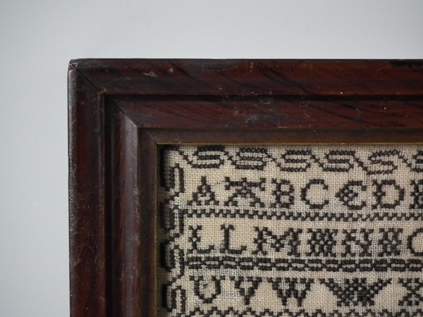 Victorian, dated Aug 10th 1843. 7.5ins by 7ins wide. 1843 alphabet Sampler by Jane Rice. Framed in a modern wood frame with glass.