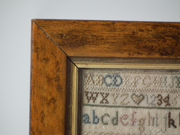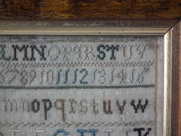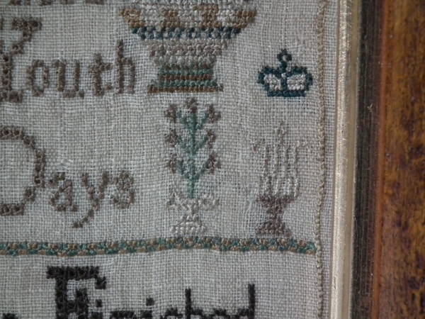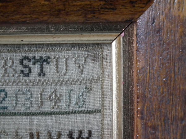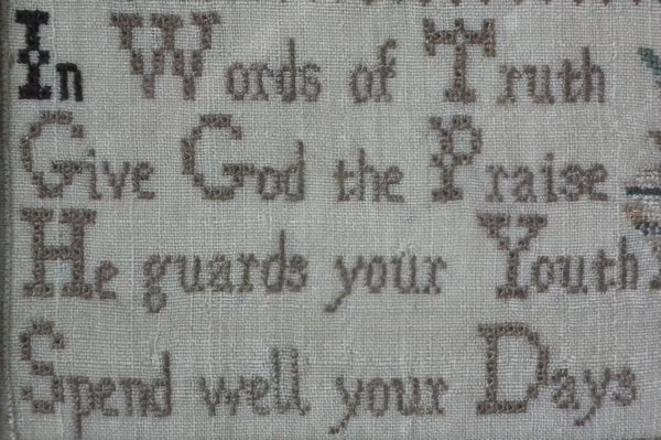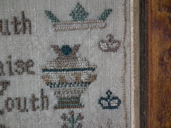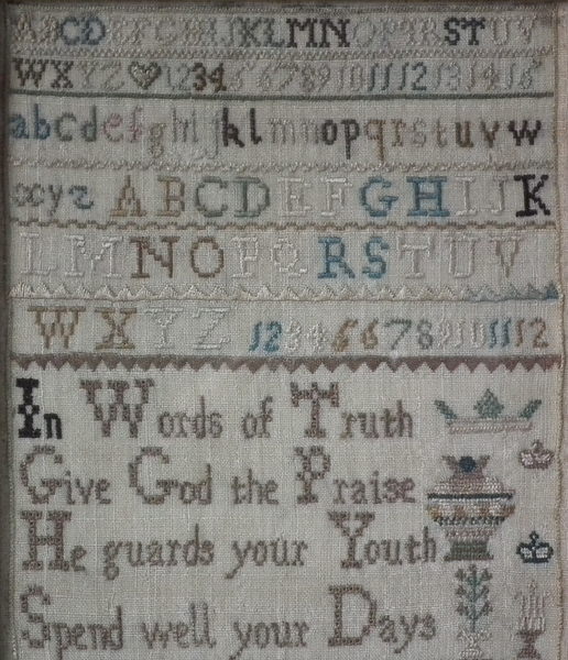 The sampler is worked in silk on linen ground, in a variety of stitches.