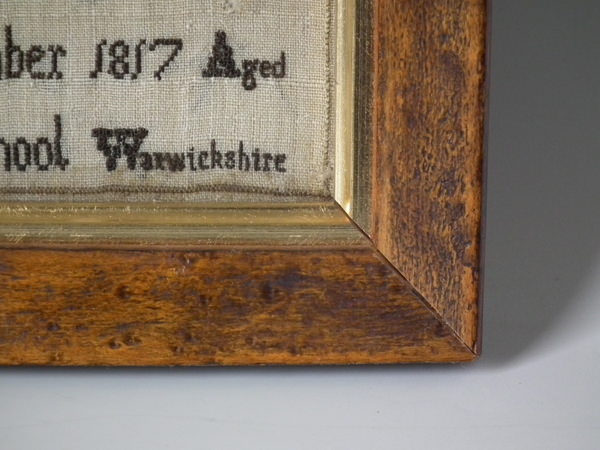George III, dated 5 December 1817. 8.5ins by 5.25ins wide. Small 1817 Stoneleigh School Sampler by Letticia Mulliss. Framed in a modern maple frame with glass.